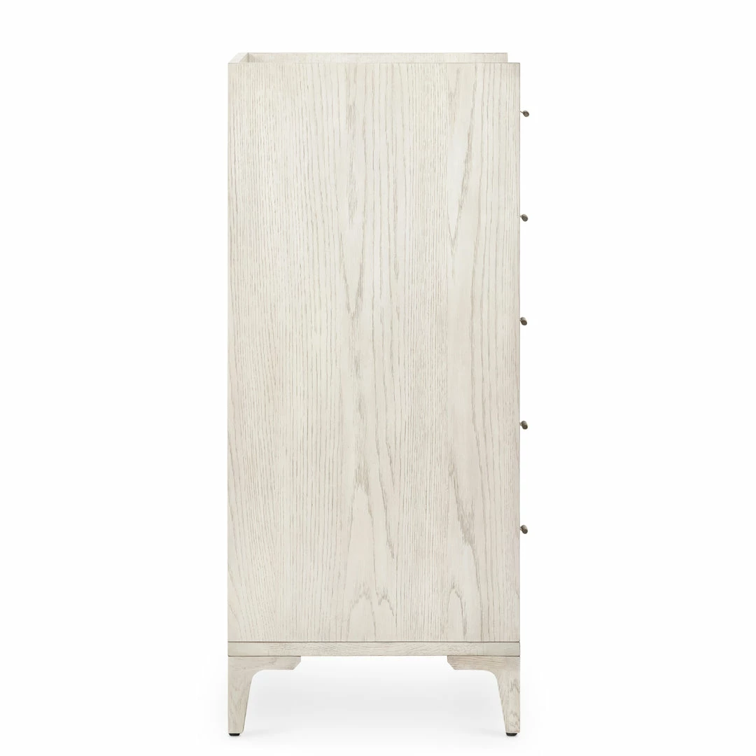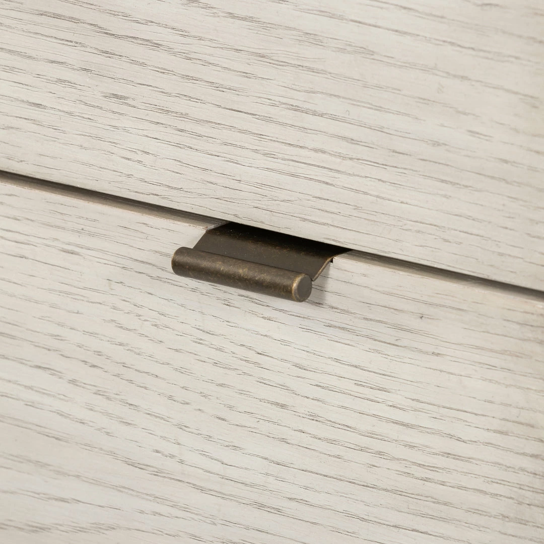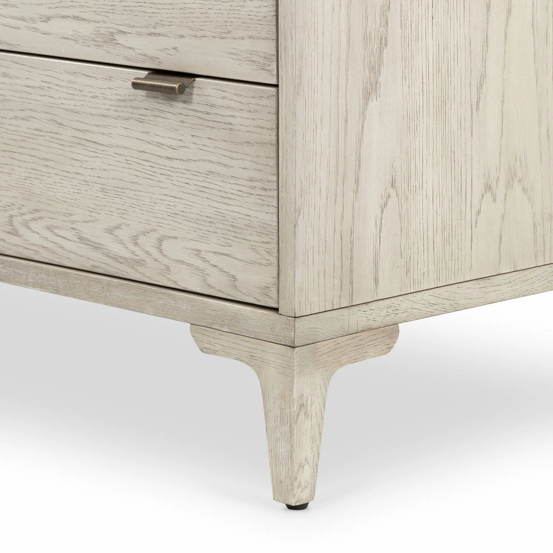 Vintage white oak is finished with a dry hand for a light look, while a top of white Italian marble offers a sophisticated material mix. Top drawer features a clever drop-down front, revealing two smaller drawers, perfect for storage of jewelry and accessories.