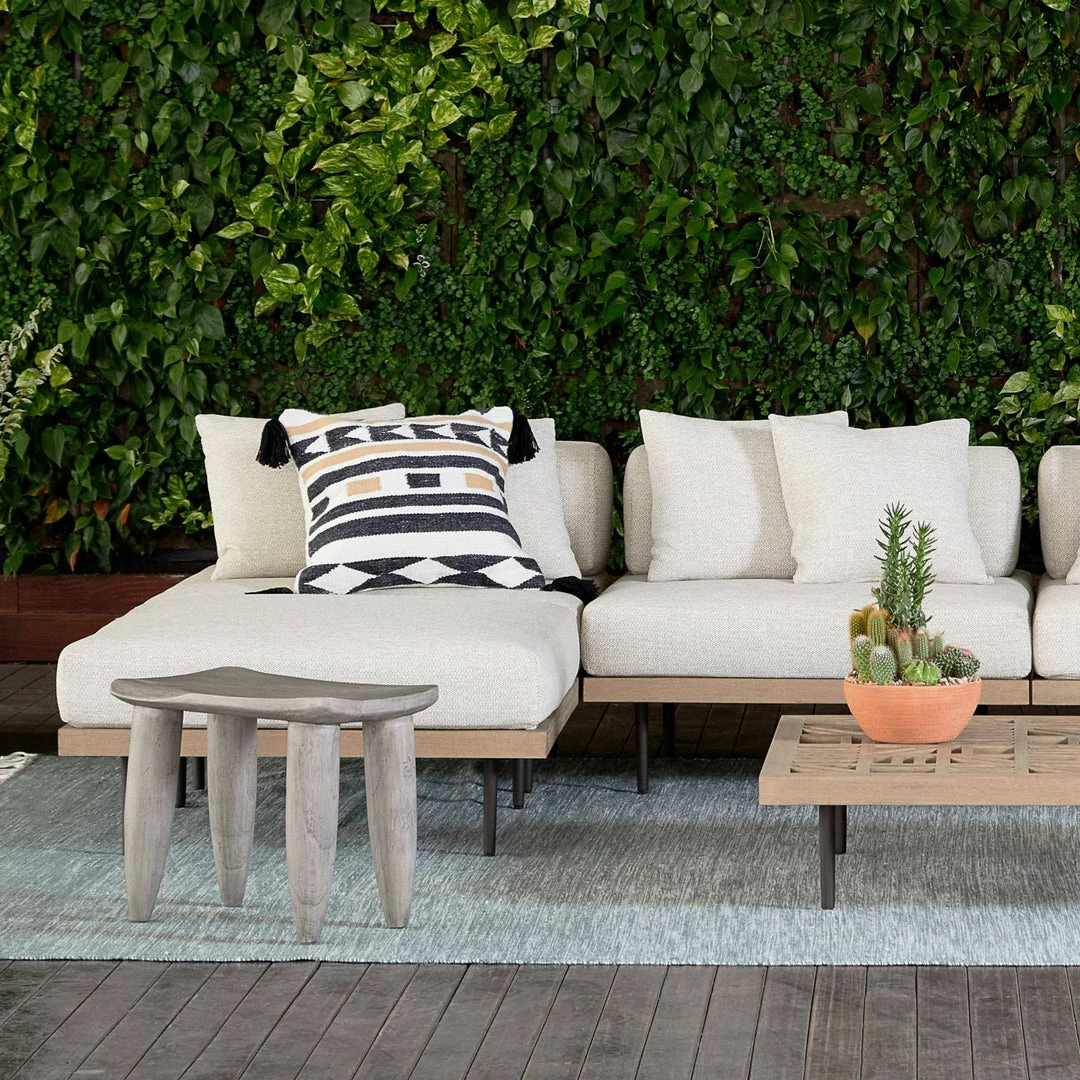 Inspired by West African design, solid ivory teak features organic knots, holes and graining to reflect its materials’ rich roots, indoors or out.