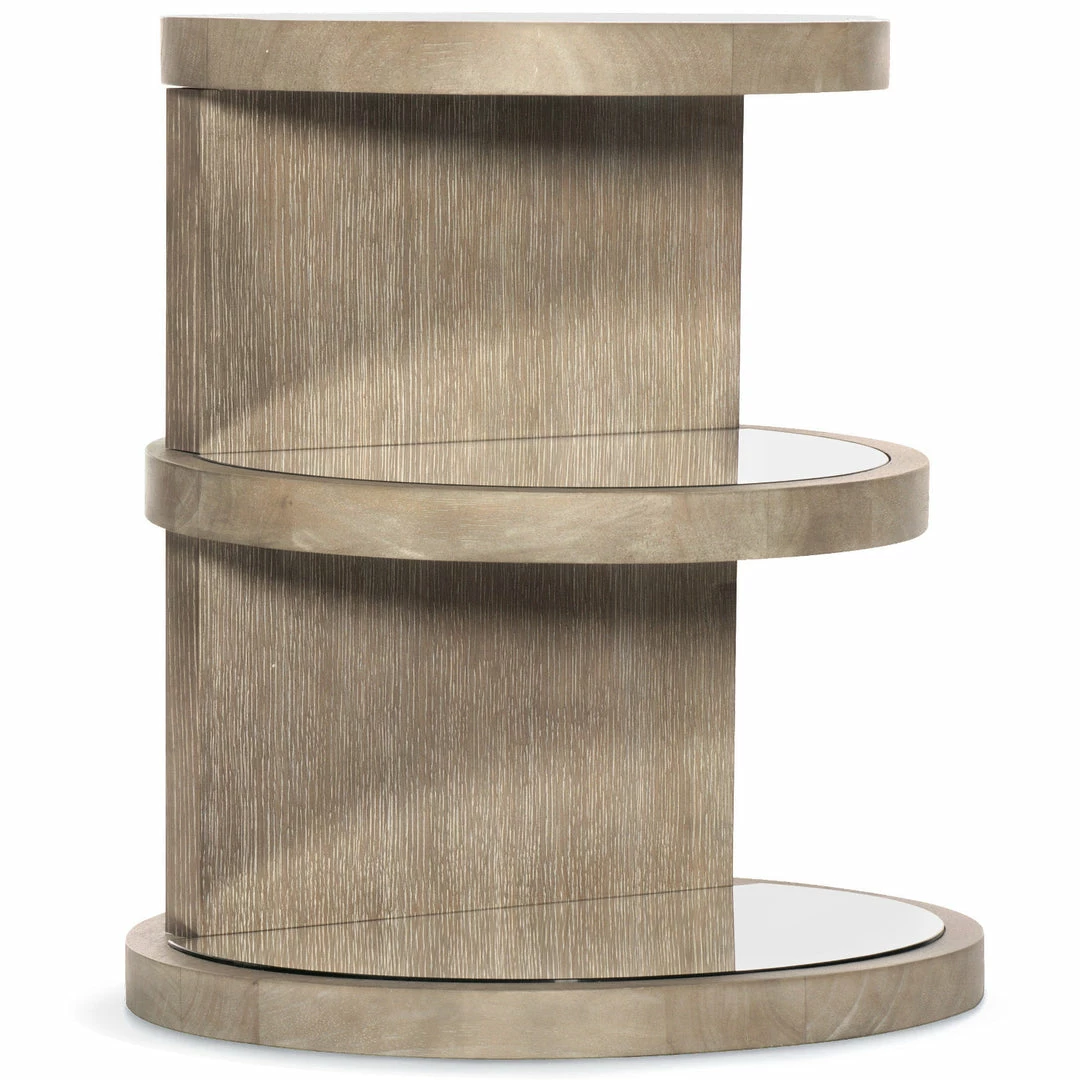 The Affinity End Table features 3-tier circle shelves in sand-blasted greige (gray/beige) finish on quartered white oak veneer. Glass inserts make this piece perfectly light and airy with contemporary beach cottage appeal.