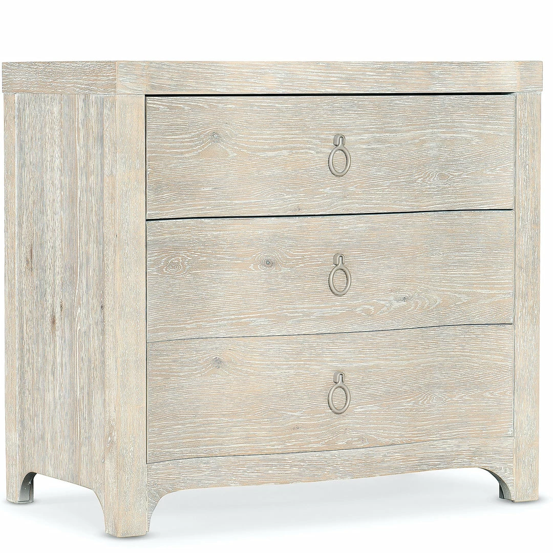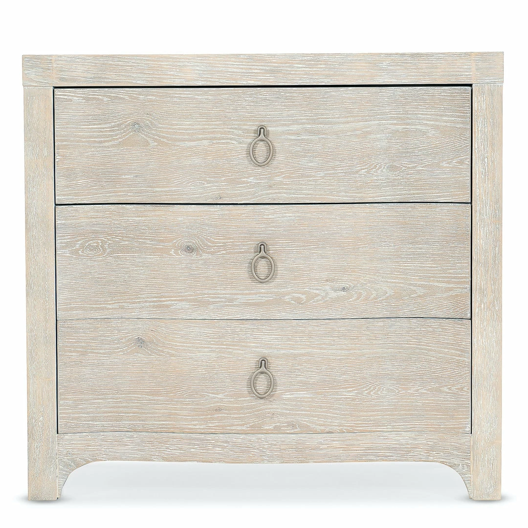Inspired by casual, waterfront living, the Antigua Three-Drawer Nightstand will bring the peacefulness of the outdoors in with its shaped front and soft texture. Crafted of Oak Veneers in a light and airy whitewashed and wire brushed Surf finish that reveals the wood grain, the nightstand has 3 drawers with soft-close drawer guides, a USB charger with two ports and a cord clip on the back. Light champagne decorative ring pulls add a designer touch.