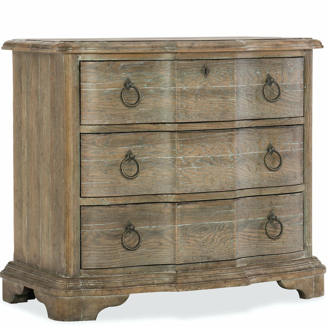 Inspired by the Belgian design aesthetic, the Bastogne Nightstand is finished in the sophisticated Antique Milk Paint, a light brown finish with nearly opaque antique milk paint overcoat offering a brush-painted effect. This three drawer chest features a handy 3-plug outlet and one live USB port, along with a three-intensity touch switch on each side and a light underneath.