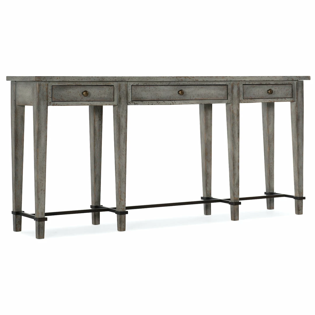 The Bella Vintage Console in a Speckled Grey finish that looks like it has aged through generations. This rustic farmhouse-inspired design features three drawers and aged bronze metal stretchers for a functional and welcoming entry piece.