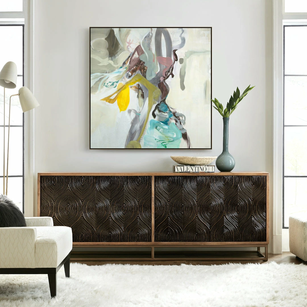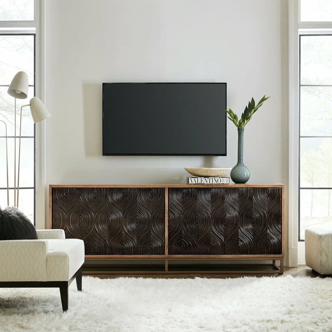 A unique swirl motif adds fresh dimension with an artisan slant. Natural mango wood casing contrasts dark wood door fronts finished with brass foil that highlights the texture and high craftsmanship. A slim iron base adds an airy, cage-like look to this clean-lined versatile storage piece.