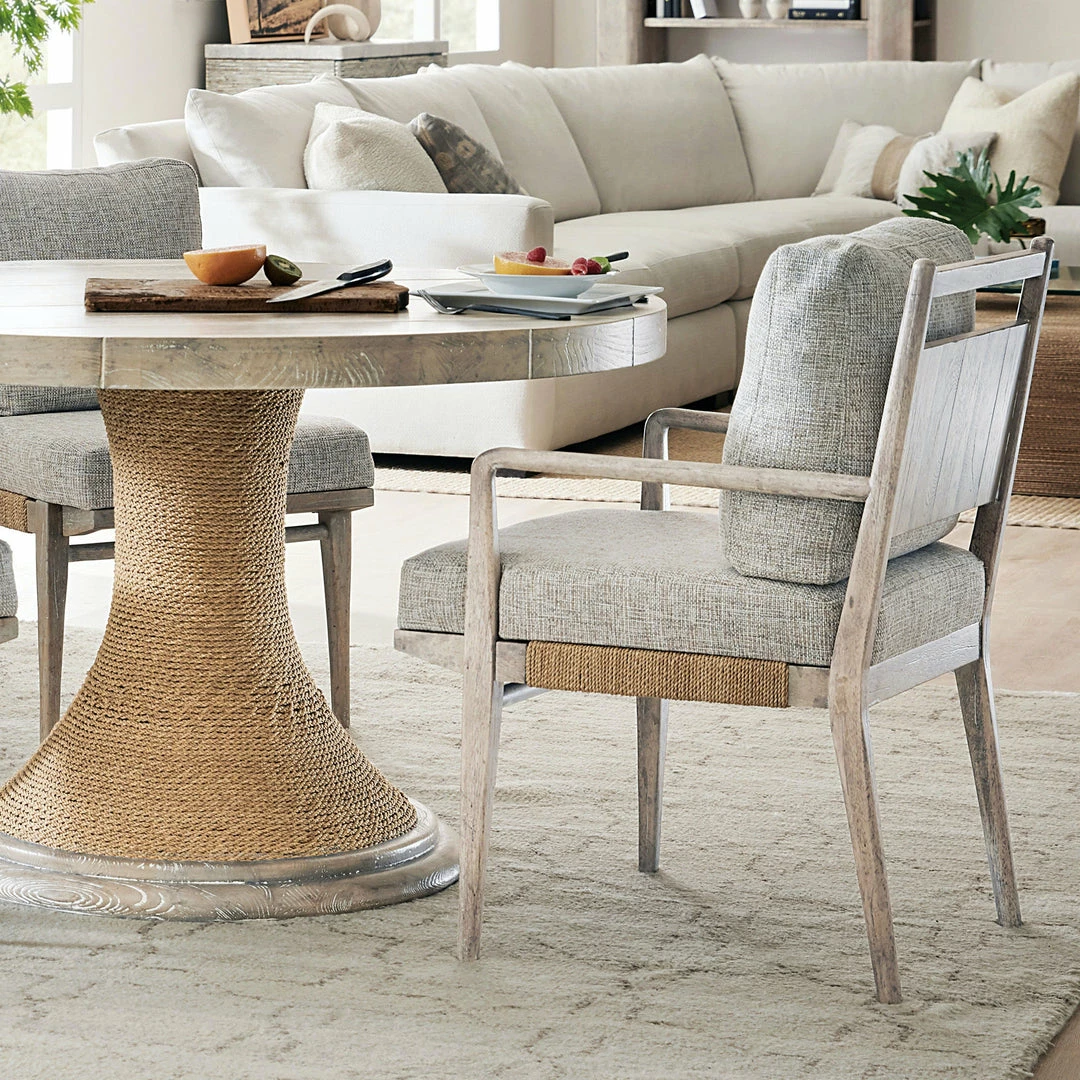 This modern, yet casual dining chair evokes rustic beach house style with its tranquil mix of organic materials in a neutral palette. Featuring rope accents and a tie-on back cushion, the Canyon Beach dining arm chair is upholstered in a tonal grey-beige basket weave fabric.