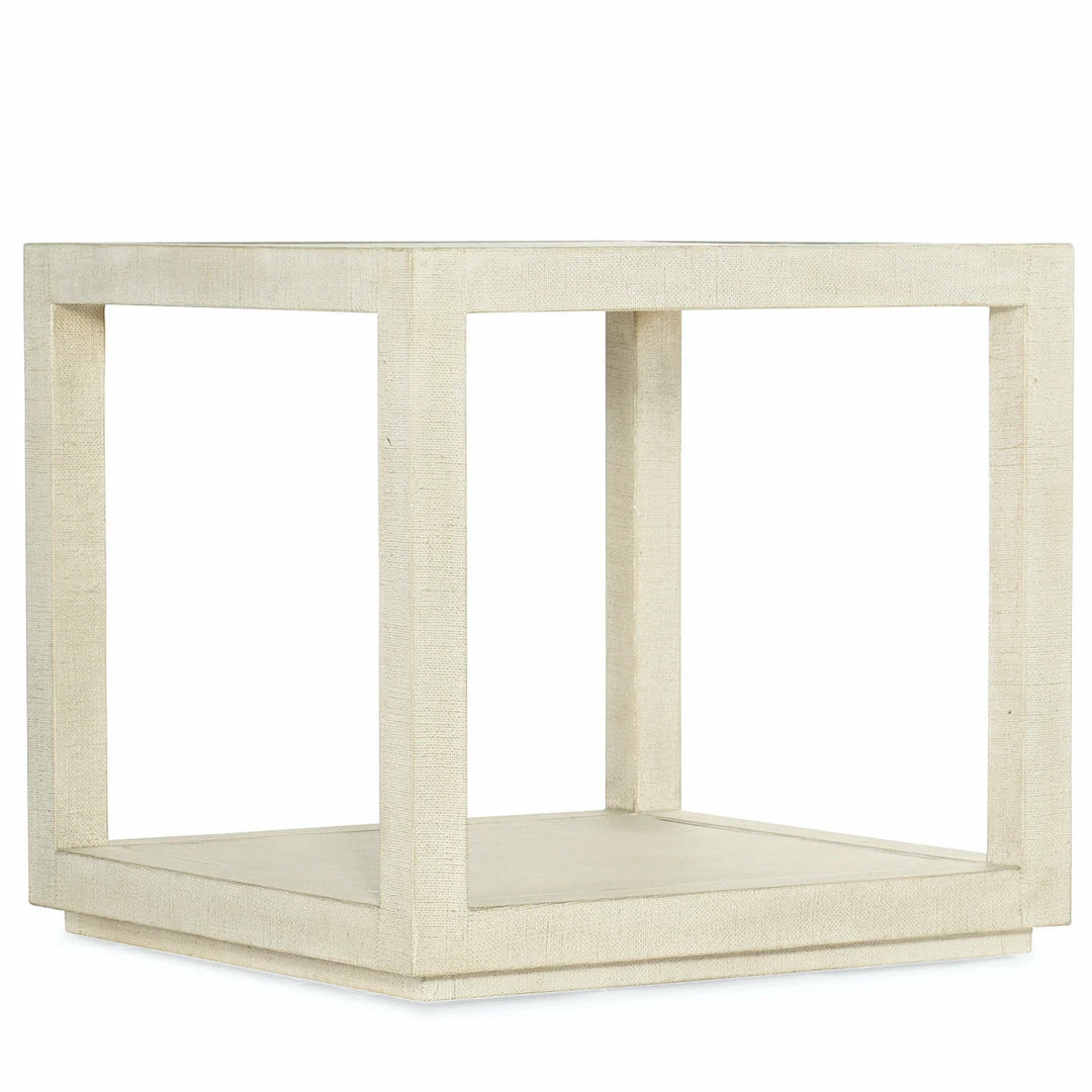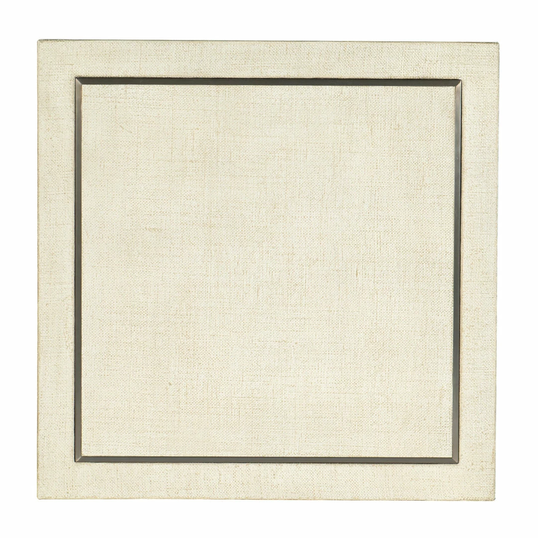 Finish: Lacquered burlap finish. Champagne colored metal inlay around top, middle shelf and bottom shelf.
