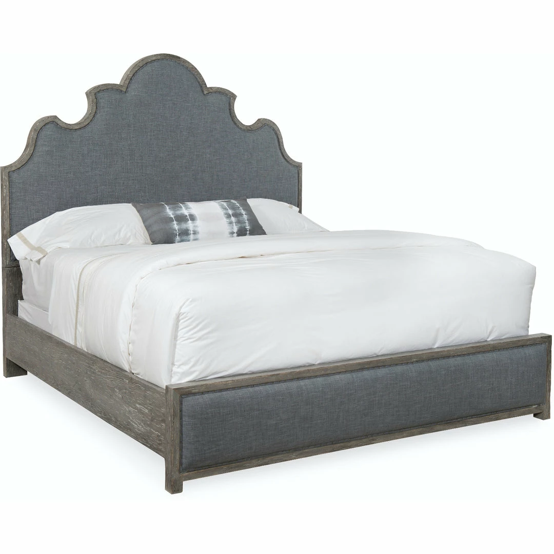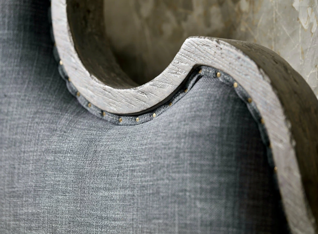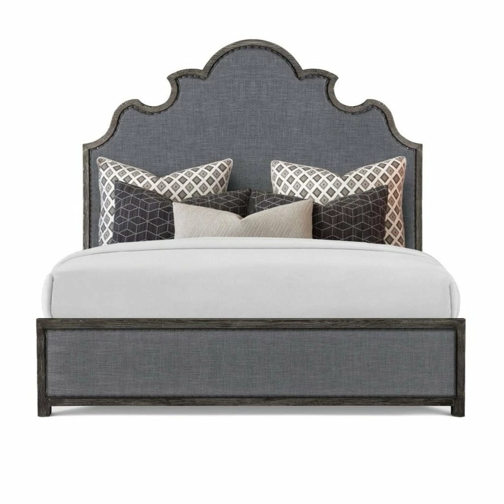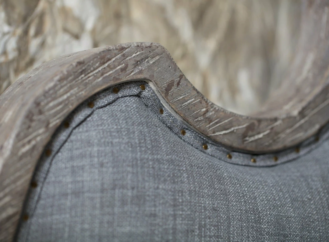 Classic in every way, this bed lets you dress it up or down whenever the mood strikes. The shaped headboard and elegant frame feature a shale grey finish with wood undertones. Upholstered in aΒ performance linen blend fabric is in a blue/grey hue to compliment the wood finish.