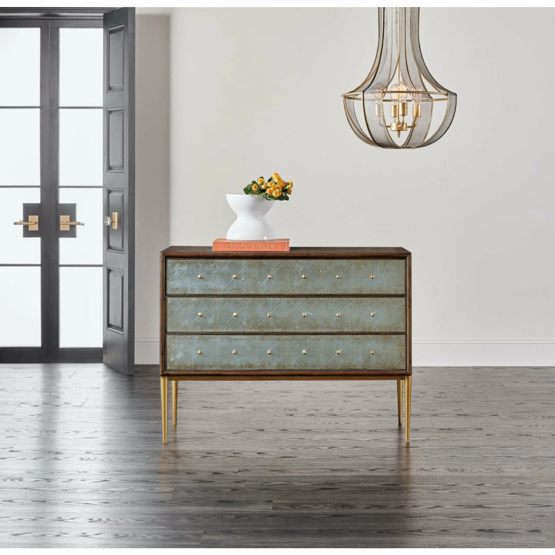 Tasteful and timeless, the Estrella Three-Drawer Chest is crafted of Swirl Mahogany with Glass, Silver Leaf and Metal and combines a dark wood finish with silver eglomise glass front doors and slim gold legs. The drawers are push-to-open and have easy to operate side-mounted metal guides.