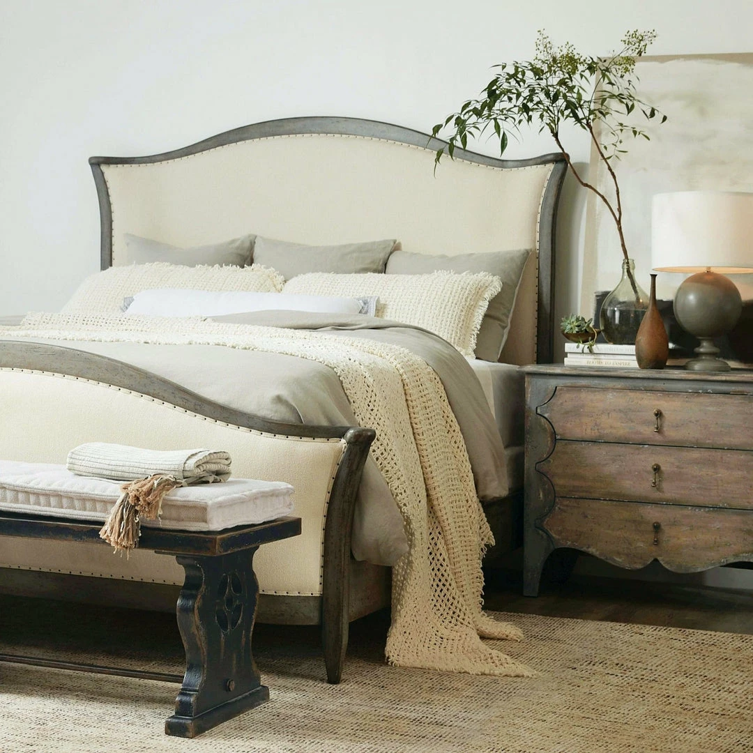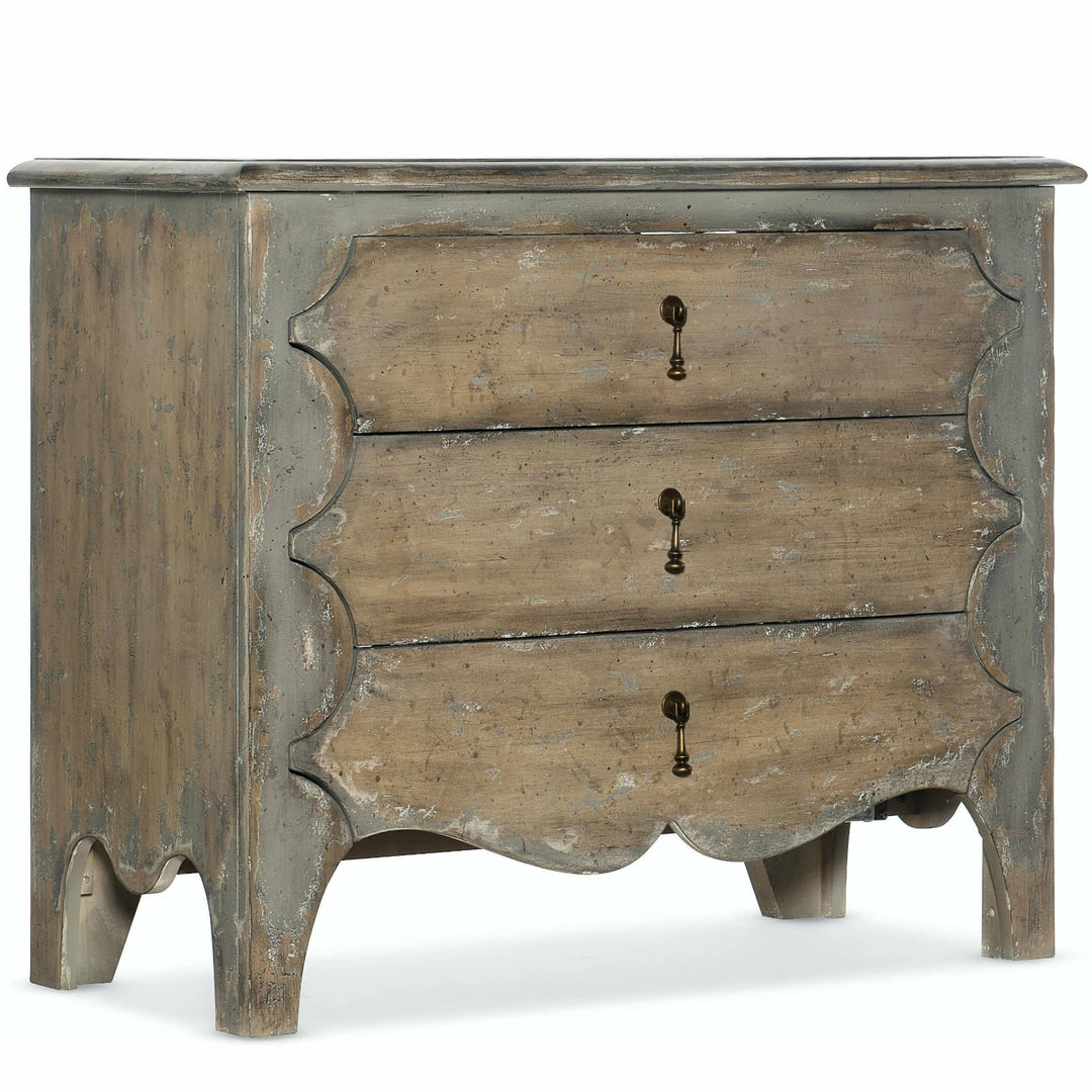 Reminiscent of a vintage flea market find, this rustic and romantic night stand is loaded with character with a European farmhouse ambiance. Pairing the soft neutral Maple rub-off finish on the body with a Time Worn Grey accent finish on the scalloped outer edges and feet for a charming touch. This 3-drawer chest features a cedar-lined bottom drawer, 3-plug electrical outlet with USB port for charging electronics.