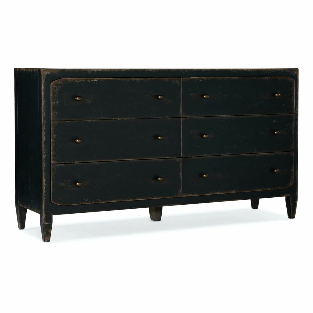Reminiscent of a vintage flea market find, this rustic and romantic dresser will bring a European farmhouse ambiance to your room. Finished in an exquisite soft black that is layered and distressed to look like it has aged gracefully through the decades.