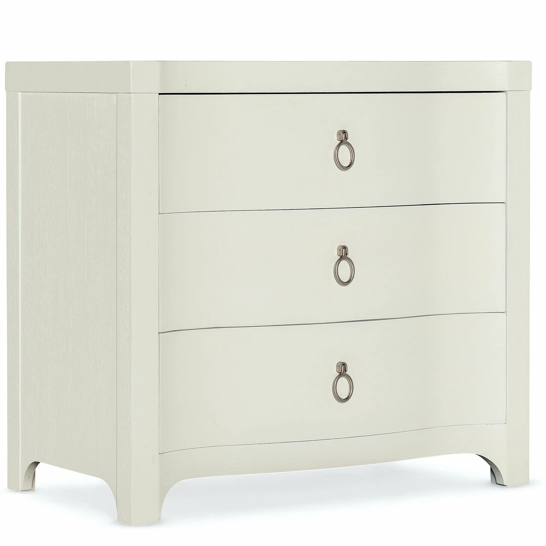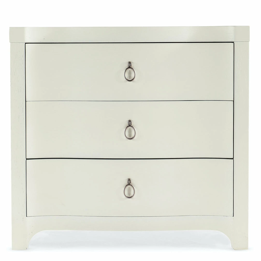 If you aspire to tranquil palettes and clean, crisp silhouettes, the Antigua Three-Drawer Nightstand will bring the peacefulness of the outdoors in with its shaped front and soft textured Shell white finish. Crafted of Oak Veneers, the nightstand has 3 drawers with soft-close drawer guides, a USB charger with two ports and a cord clip on the back. Light champagne decorative ring pulls add a designer touch.