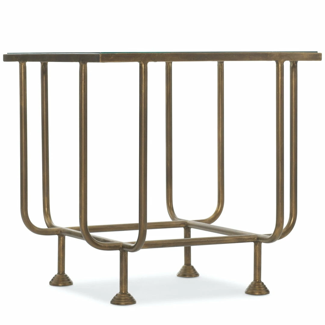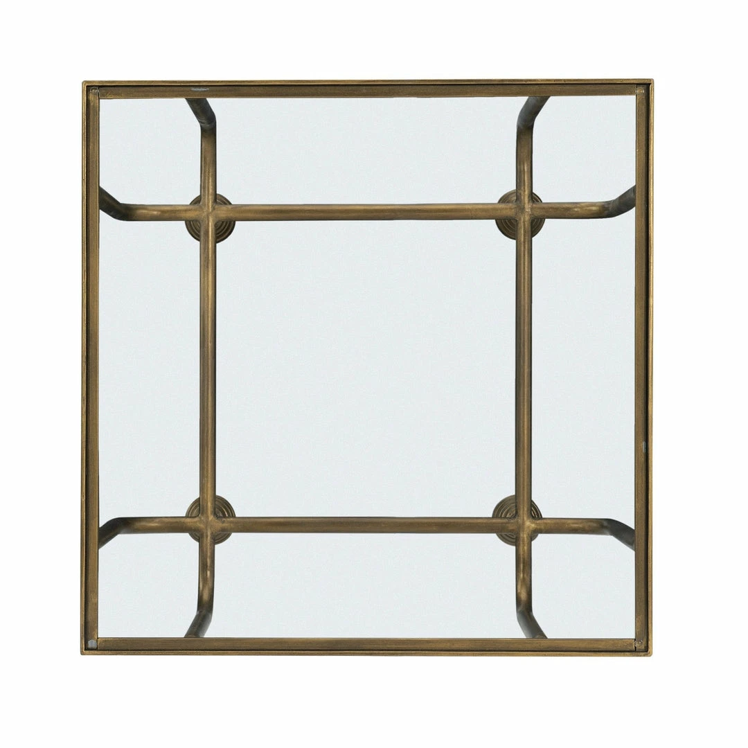 A classic take on industrial style. The iron pipe base is curved and welded together to fashion a simple yet beautiful design. Finished in antique bronze and topped with clear tempered glass.