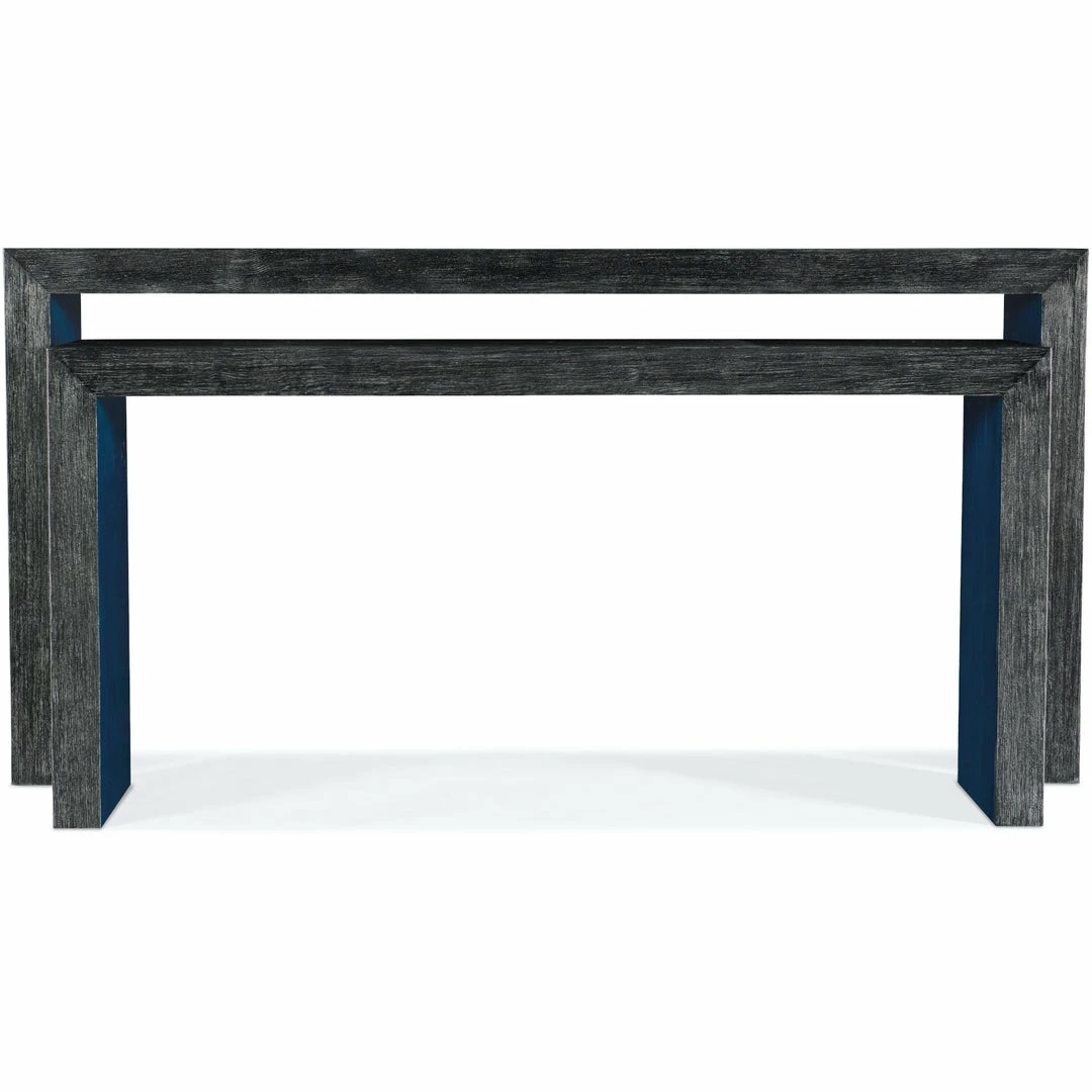 Rustic and modern with a chic flair, the Halen Nesting Sofa Tables have a clean and simple silhouette. Crafted of Pine and Maple Veneers, the exterior is finished in black, with a blue painted finish on the inside legs. Both tables are 14 inches deep, and the smaller table fits underneath the larger one.