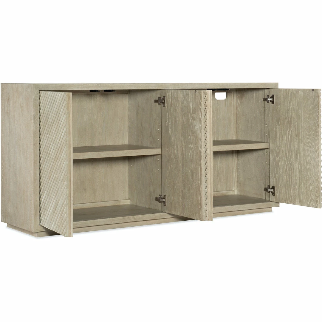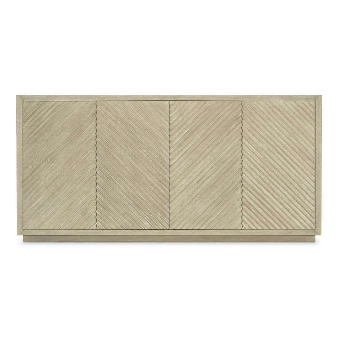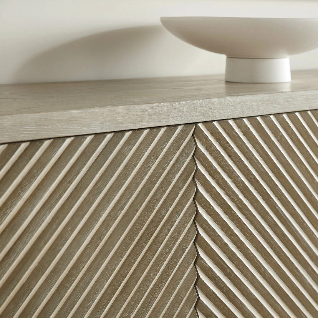 The Palisades Credenza invokes modern Zen with its streamlined design in a light and airy neutral color palette. Reeded door fronts add texture and create a subtle geometric pattern that centers the design of this four drawer cabinet.