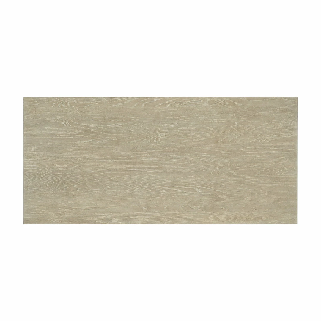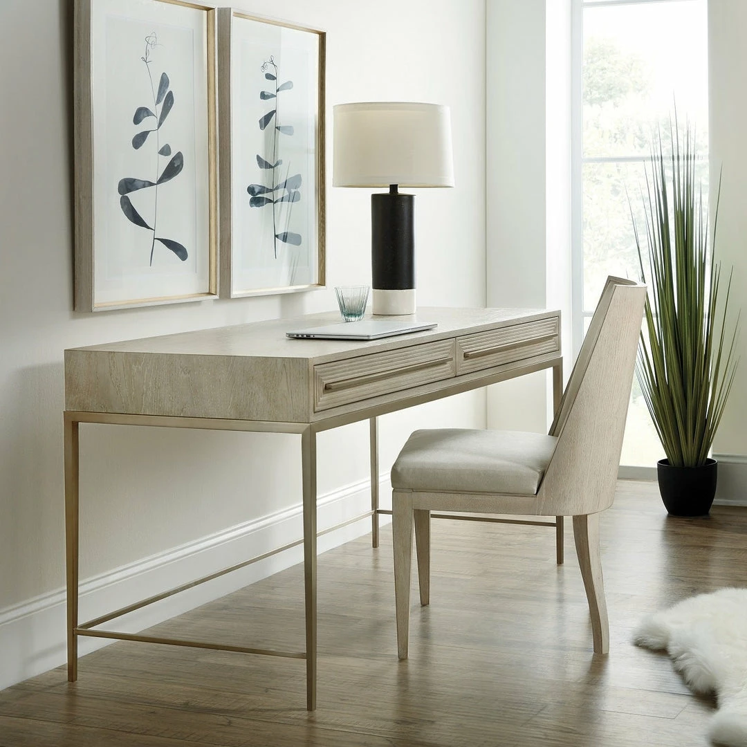 Svelte and sophisticated in a serene soft finish on Oak Veneers with tactile reeded drawer fronts, the Palisades Writing Desk is a stylish statement piece and a functional work-from-home solution. The Terrain finish on oak veneers is dry-brushed for a casual appeal and accented by champagne-colored bar pull hardware and slender metal legs joined by stretchers on the sides and back. The left drawer has one removable pencil tray with a felt bottom that can be used in either drawer, and the right drawer has one removable divider with two sides.