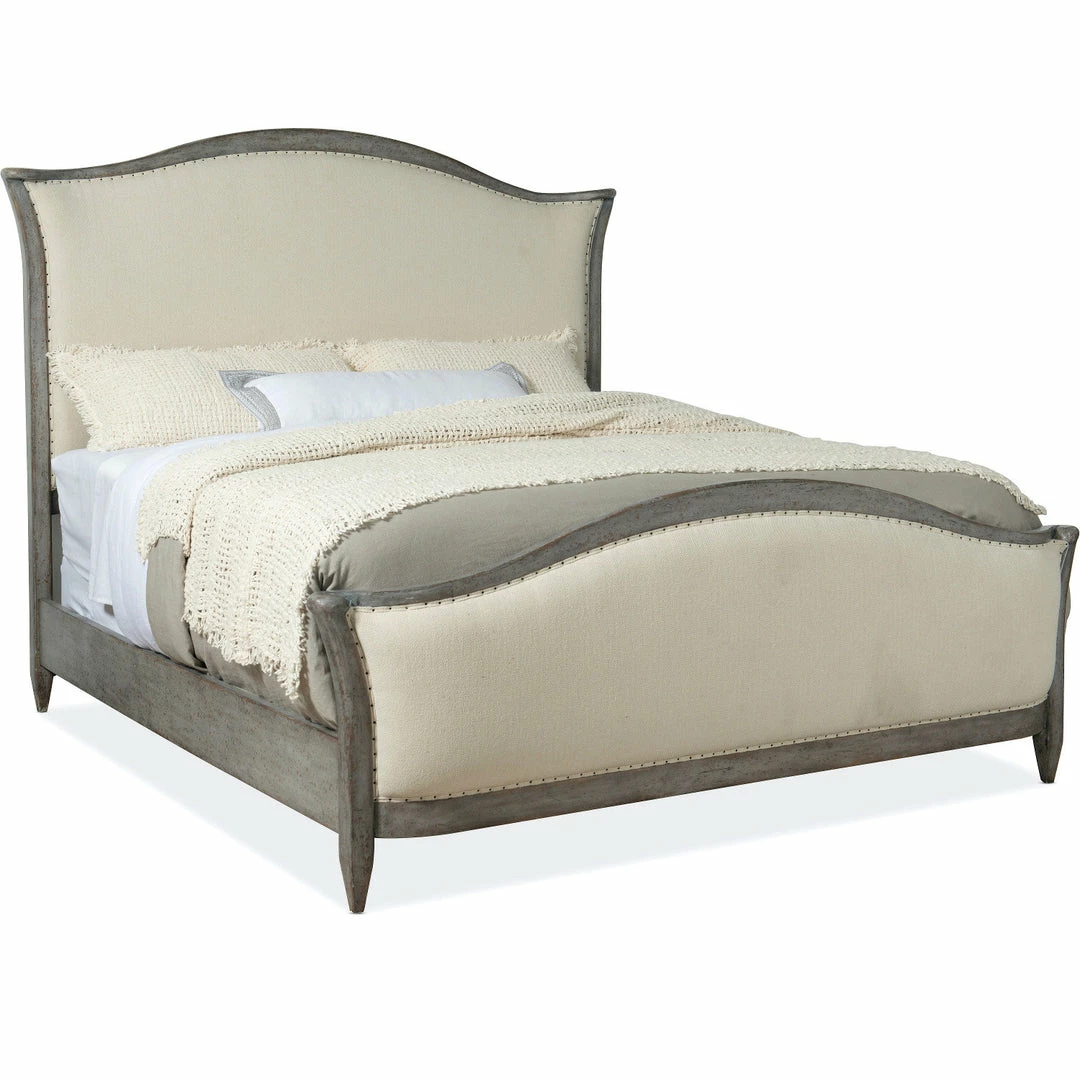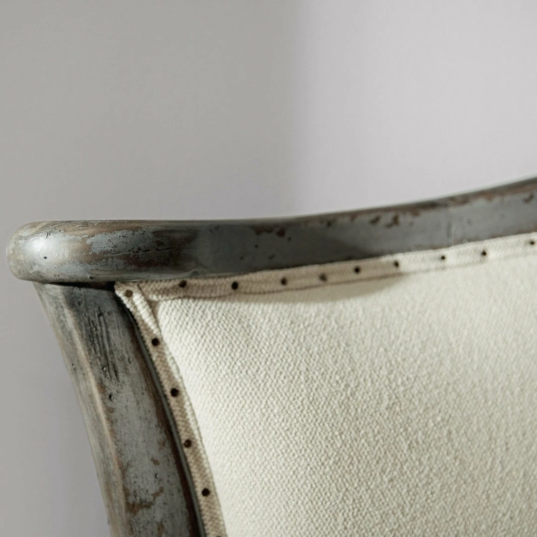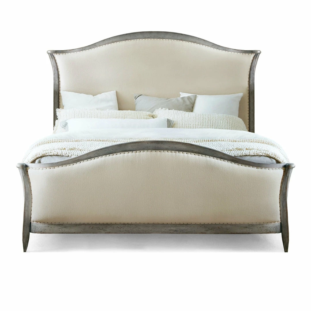 Inspired by the small farmhouses that dot the French countryside, the Parisian bed is a contemporary take on 18th-century European furniture. Beautifully upholstered in a creamy Tuscan white fabric with nail head trim, the wood frame is finished in timeworn speckled grey accentuating the historical nature of this classic design.