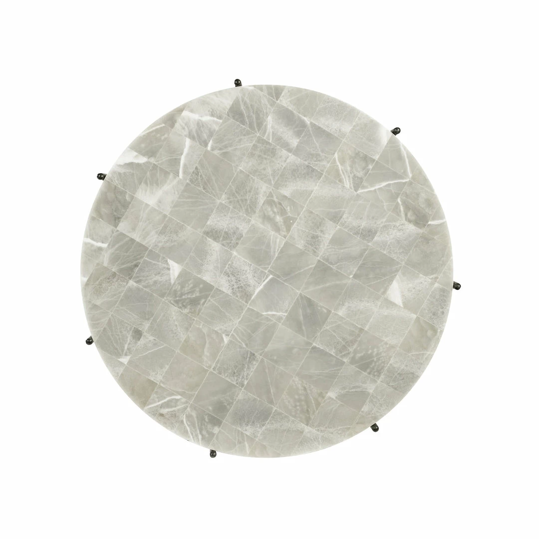 Industrial meets couture chic. Combining an alluring round White Onyx top and bottom shelf with patterned veining set in a slender iron frame, the Pavia Cocktail Table creates a versatile focal point that will add function and fashion to your living space.