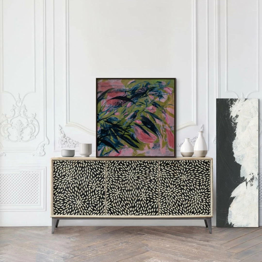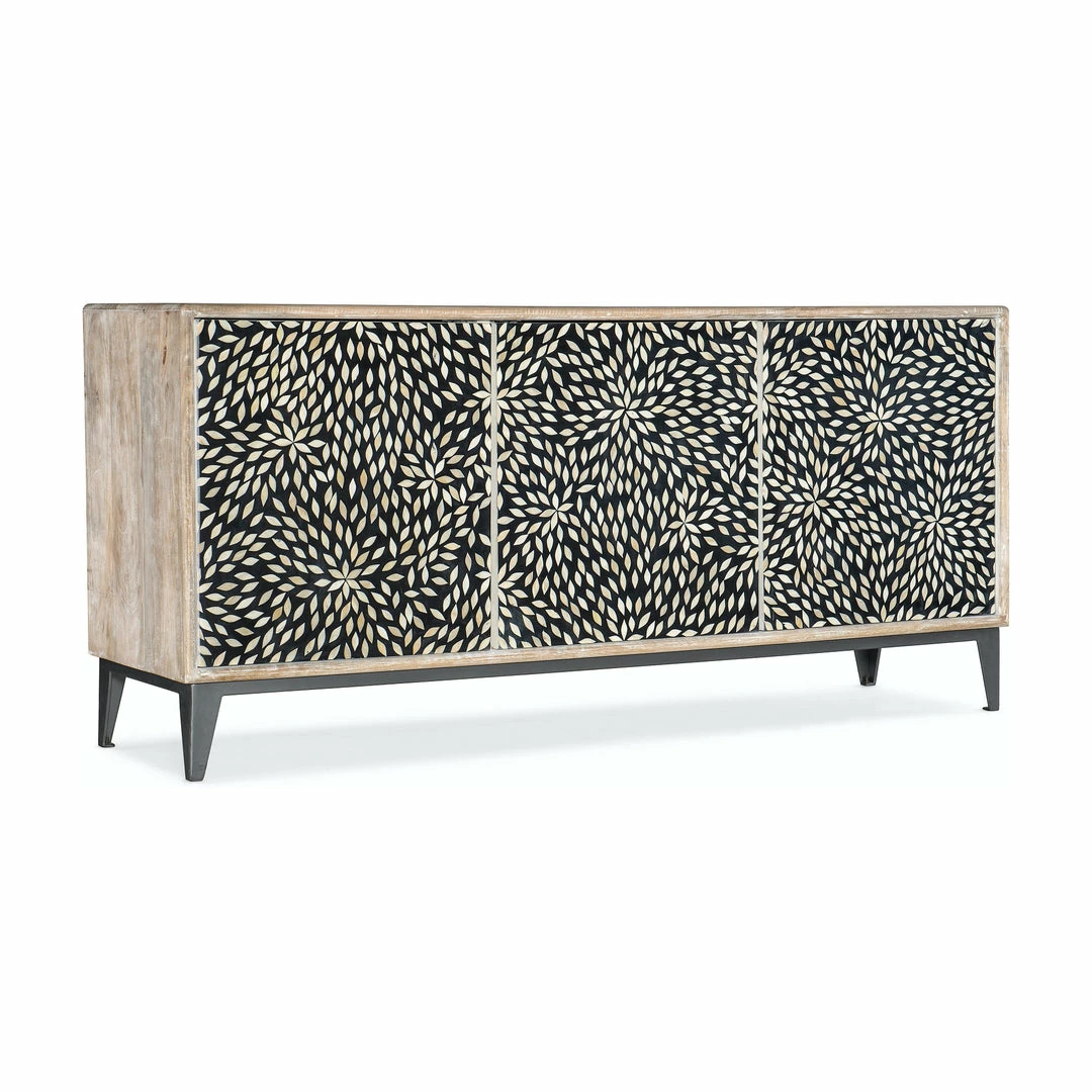 Light natural casing surrounds three door fronts with a graphic black and white bone inlay mosaic to create a majorly artistic statement piece. Spacious interior shelving brings ample storage to the dining or living room, with rear cutouts for cord management.