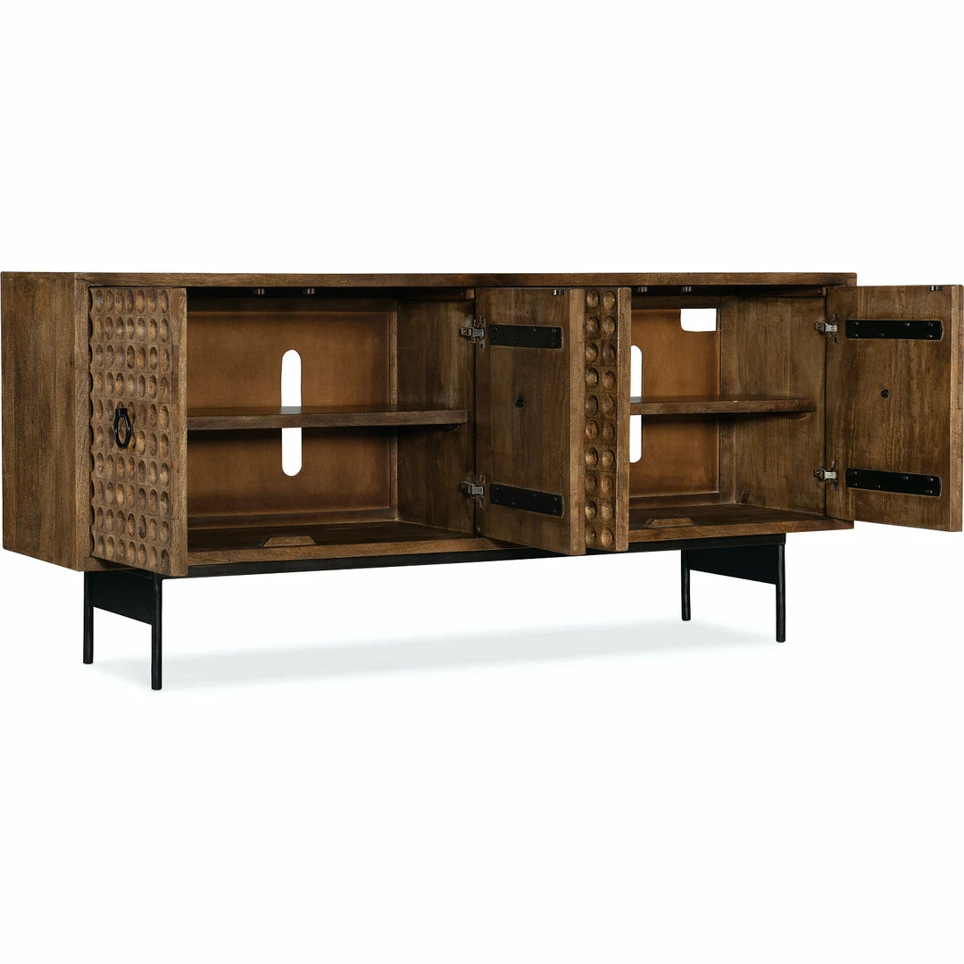 A natural, beautifully storied piece. Crafted from mango wood, the door fronts feature intricate circular carvings for an abstract, global-inspired look. This versatile console can be used in a room with ventilated back panel for media storage and wire management.