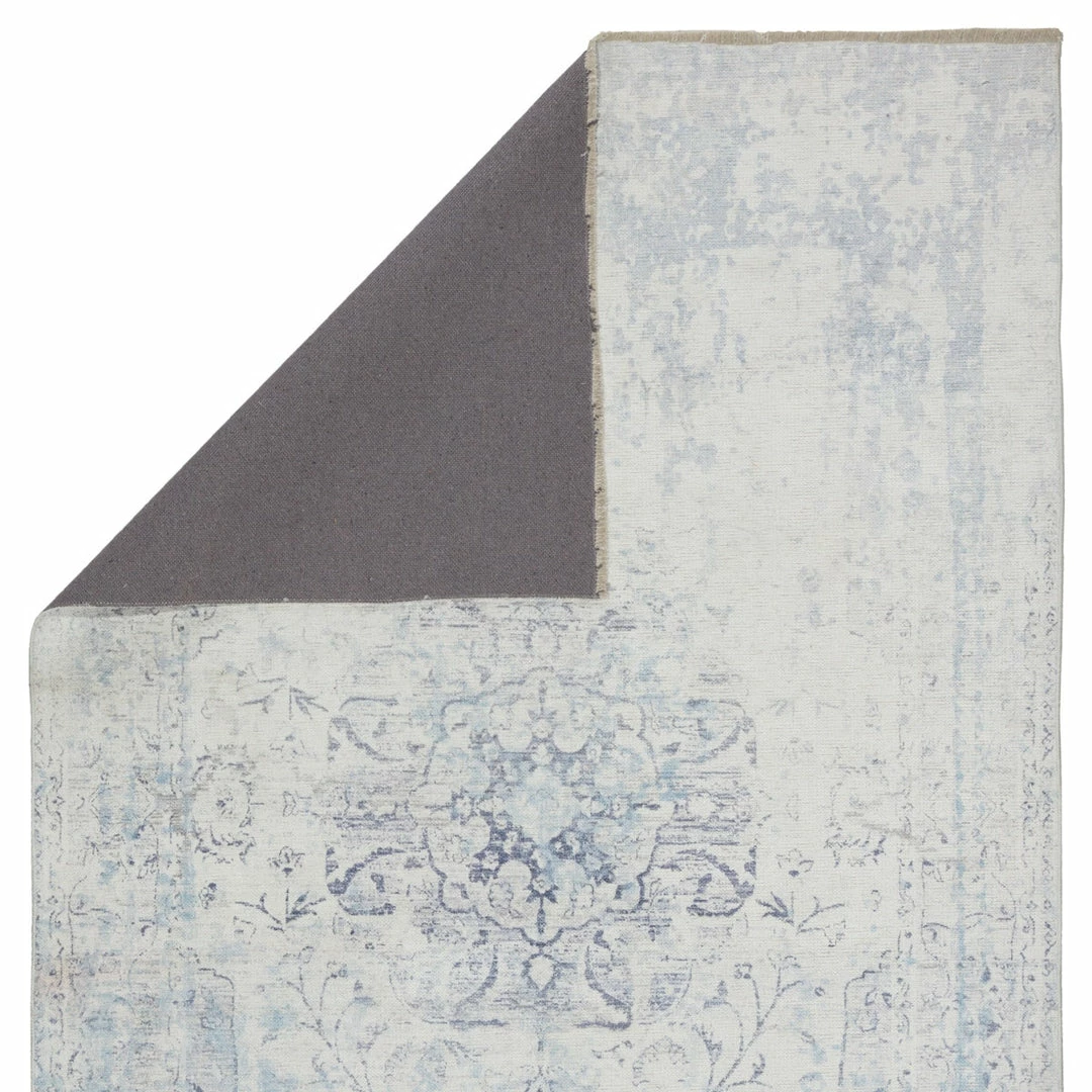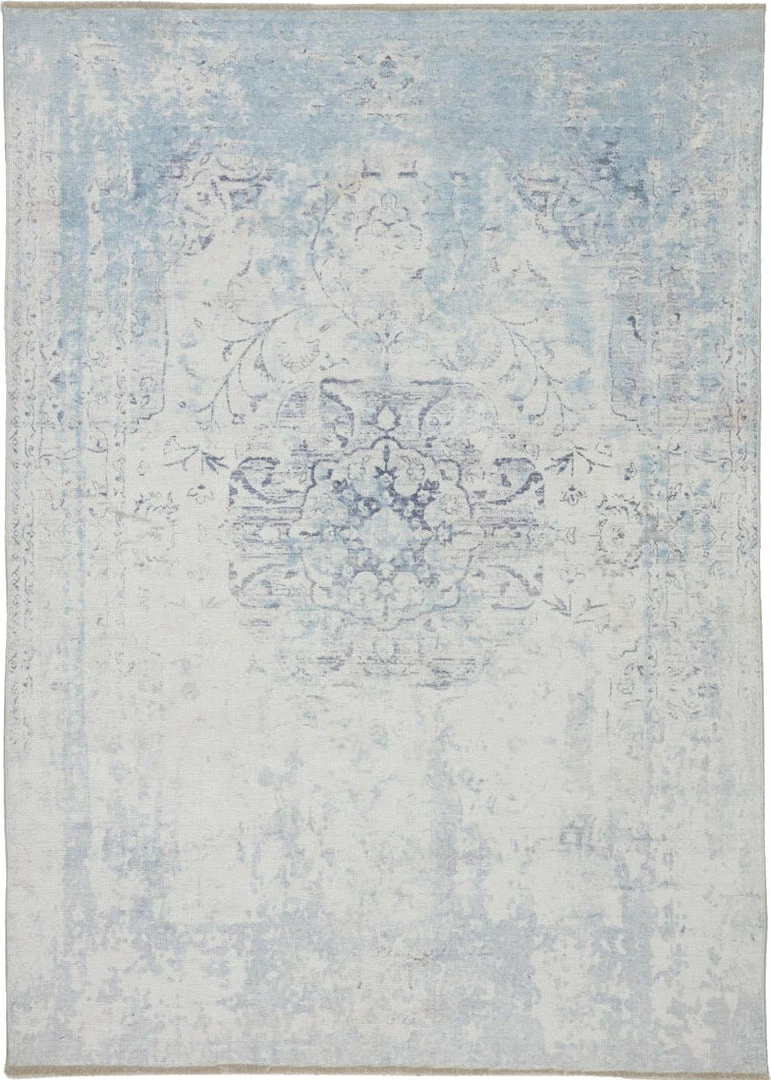 The Boheme collection brings vintage inspiration to life with ornate, worldly designs and a timeless distress effect. The Contessa area rug features a digitally printed and elegantly faded center medallion in serene hues of blue and white. This low-profile rug is made of cotton, polyester, and soft chenille for a flat, durable finish.