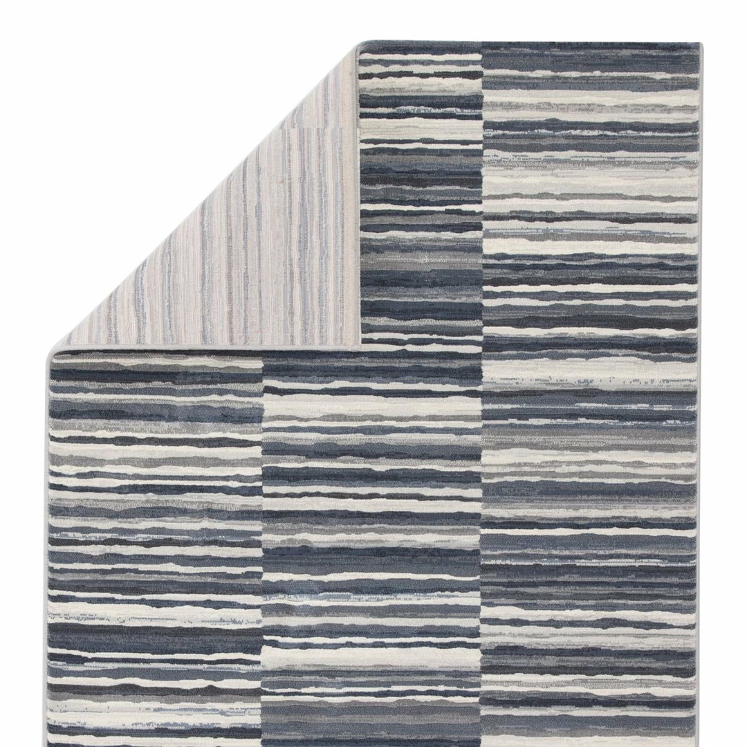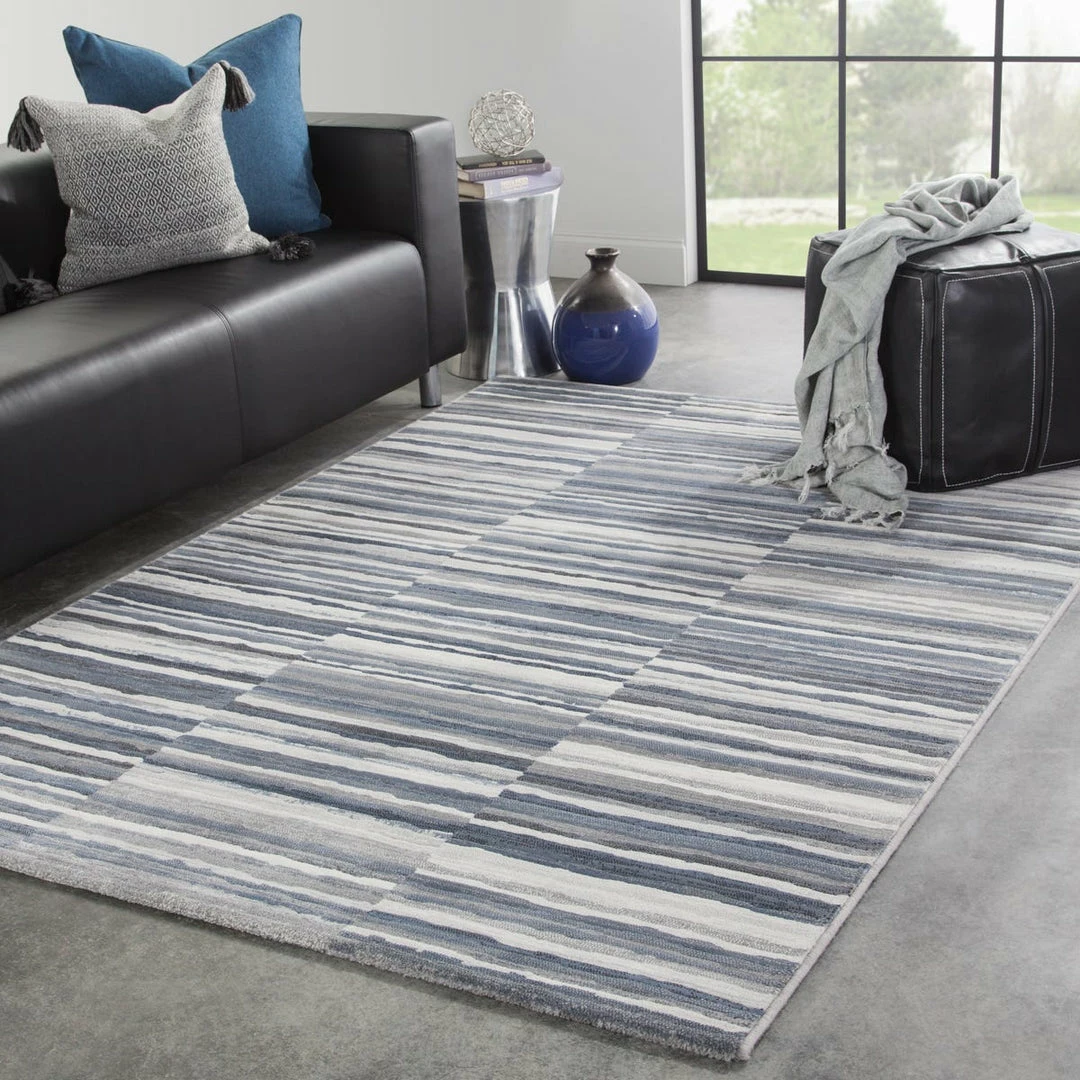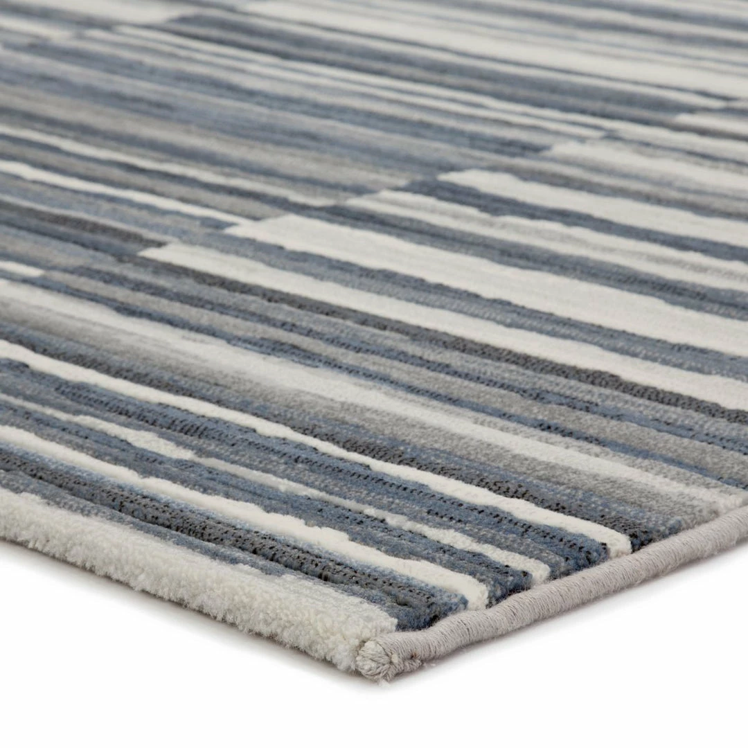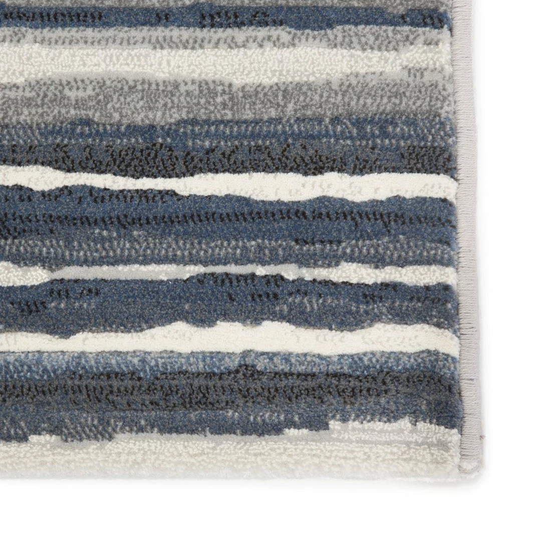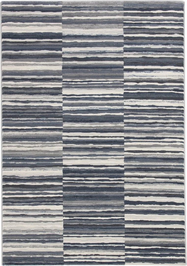 The Dash collection features an assortment of eye-catching, globally inspired repeat patterns. The durable, power-loomed Kenith area rug is a contemporary accent with a fresh take on classic stripes. Variegated bands of gray, blue, and white create a dynamic pattern on this easy-care polypropylene accent.