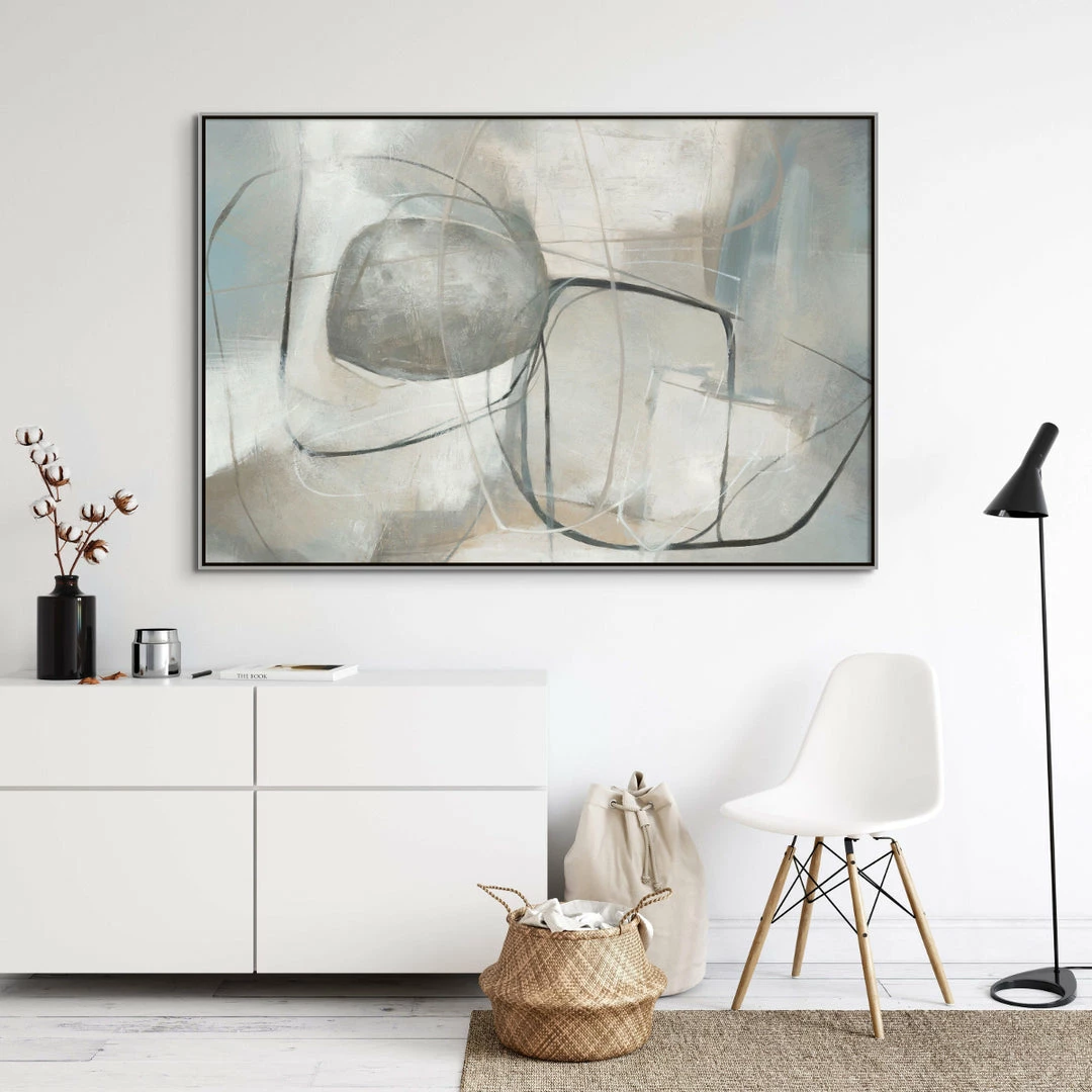 “Circular Path” abstract artwork in soft grey and neutral hues by Jacob Lincoln is printed on premium substrate comprised of a blend of non-woven fabrics. The grain of this luxurious material adds a beautiful texture and depth to the imagery. This gallery-wrapped giclee print on fiber canvas is hand stretched over 1.5″ stretcher bar with your choice of optional frame finishes.