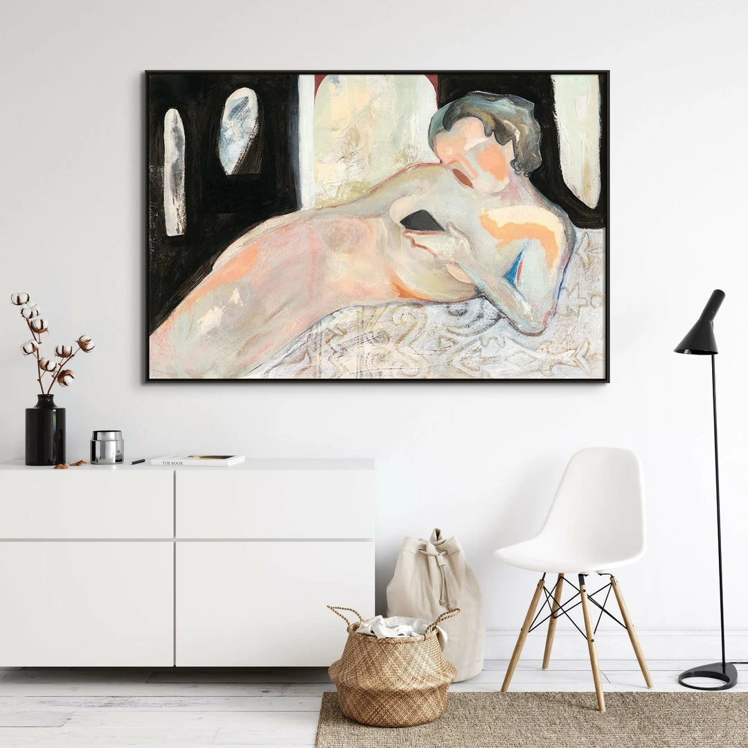 “Cloth Phone” abstract figurative artwork by Athena Rose is printed on canvas with strokes of texture that follow the image to enhance the authentic feel of the piece. This gallery-wrapped giclee is hand stretched over 1.5″ stretcher bar with your choice of optional frame finishes.