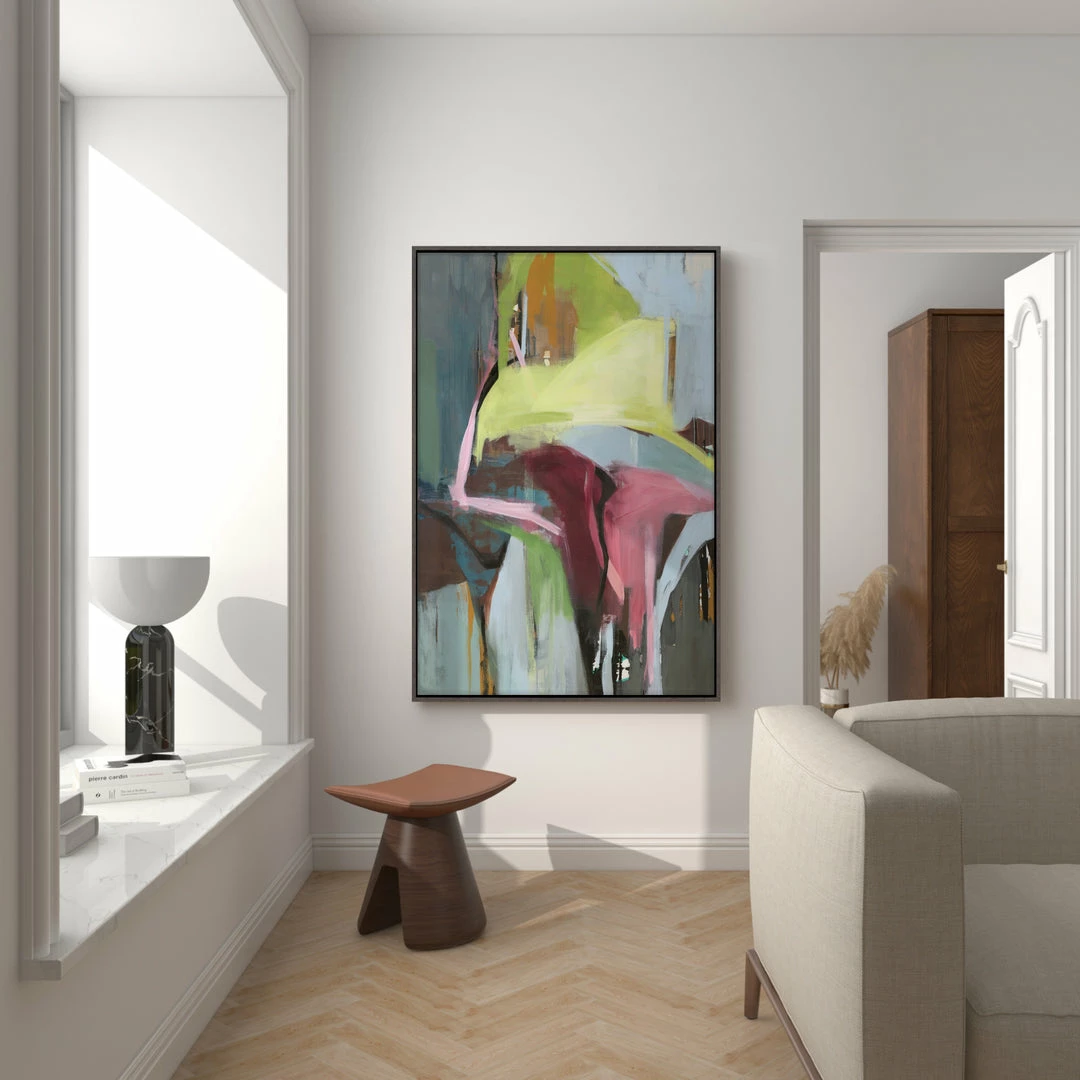 “Eclectic Blues” abstract artwork by Giselle Kelly is printed on canvas with strokes of the original image applied with an artist brush to enhance the authentic feel of the piece. This gallery-wrapped giclee is hand stretched over 1.5″ stretcher bar with your choice of optional frame finishes.
