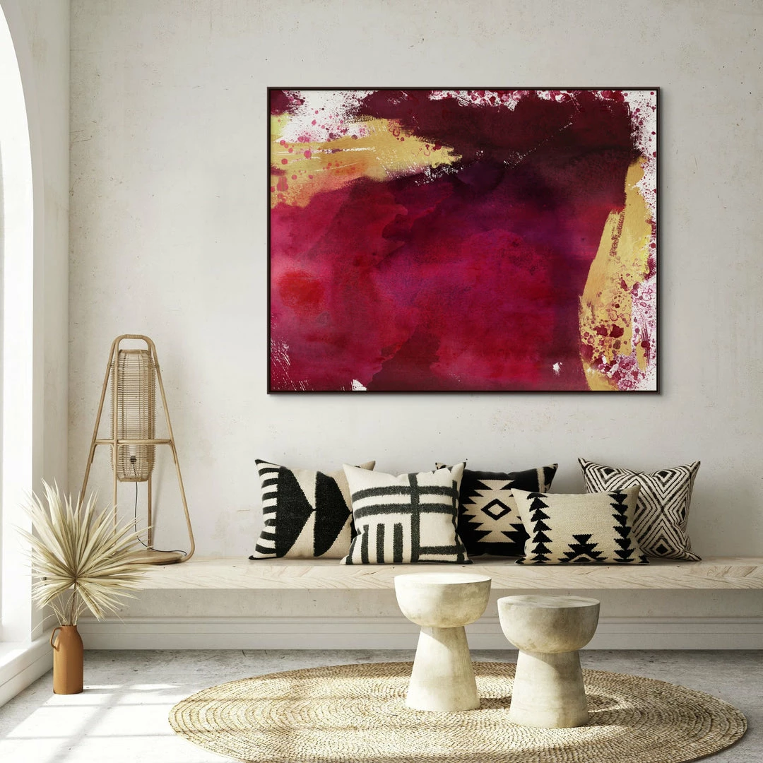 A lovely splash of fuchsia, magenta, purple and red hues with metallic gold leaf embellishment come together in this abstract canvas art by Mari Urasawa. This gallery-wrapped giclee is hand stretched over 1.5″ stretcher bar with your choice of optional frame finishes.