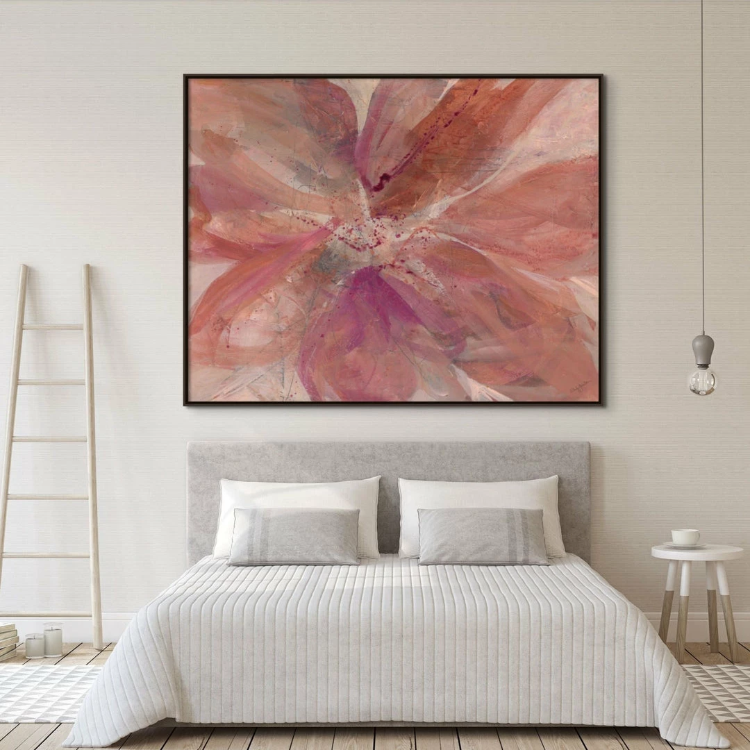 “Love me, love me not…” abstract floral artwork by Wendy Hamilton is printed on linen for natural texture. This gallery-wrapped giclee is hand stretched over 1.5″ stretcher bar with your choice of optional frame finishes.