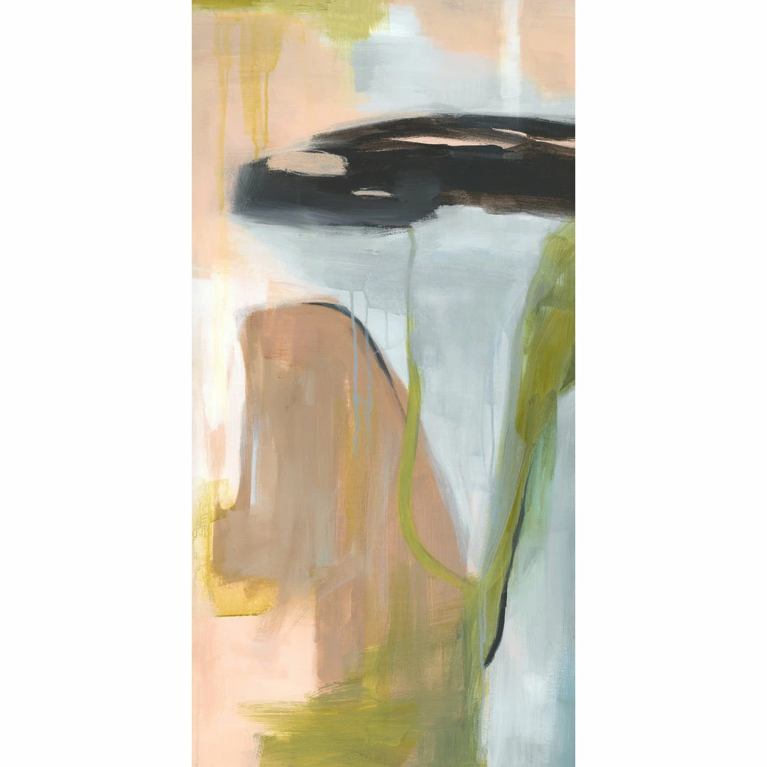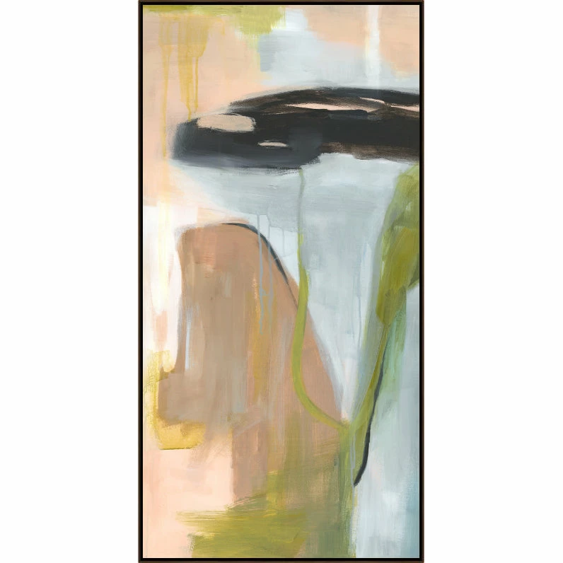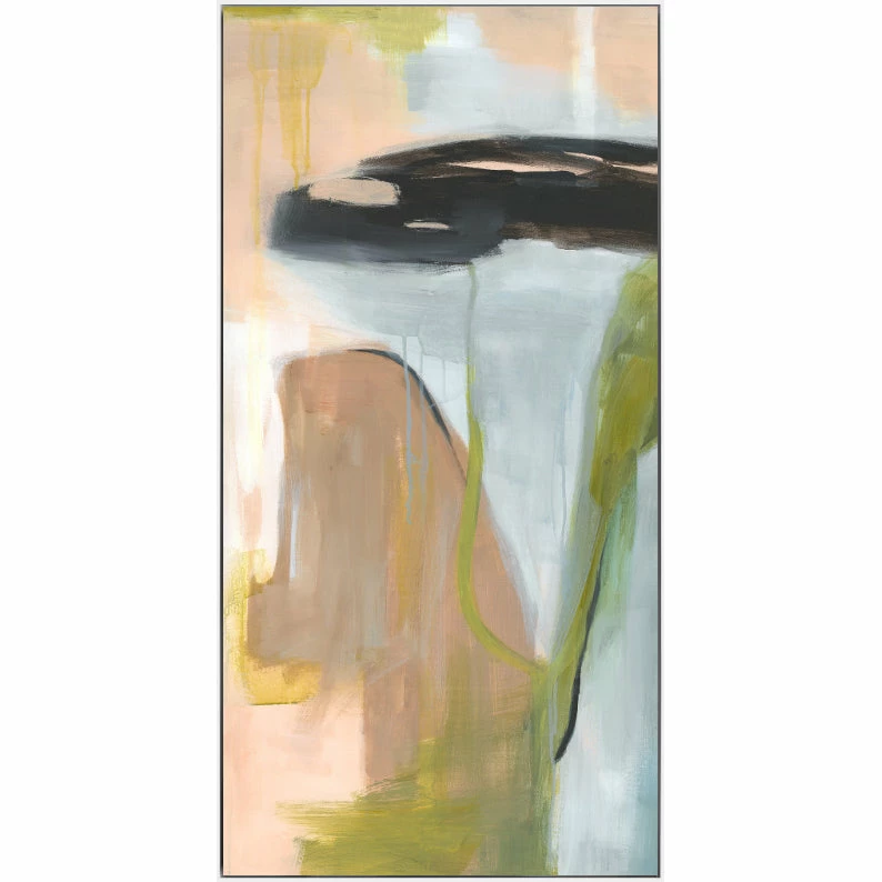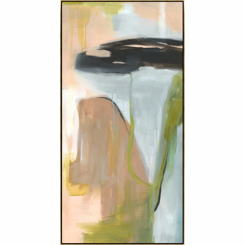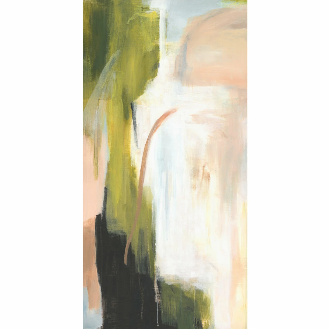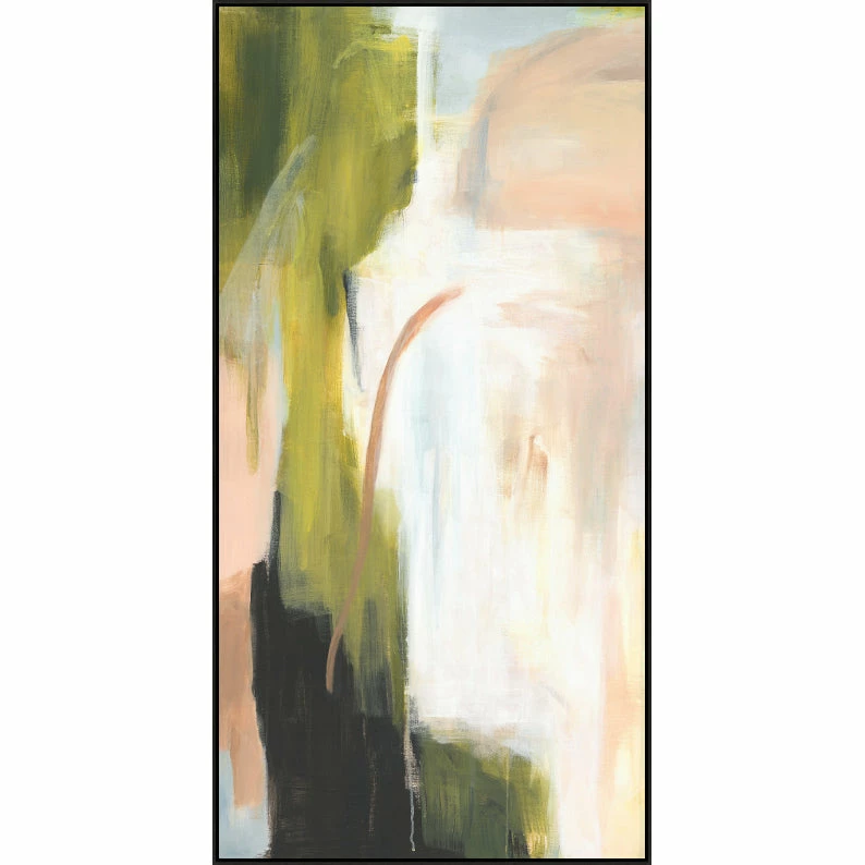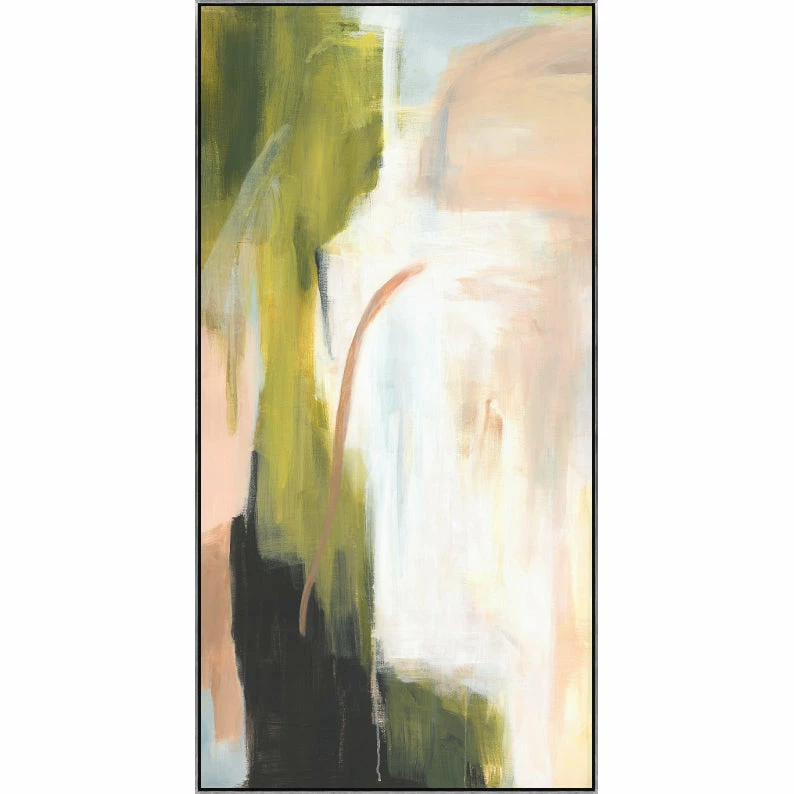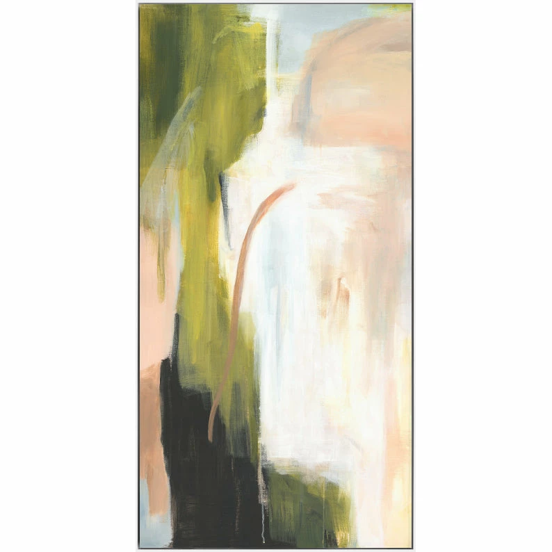 “Majestic Field” abstract artwork in hues of blush and green by Giselle Kelly is printed on canvas with strokes of the original image applied with an artist brush to enhance the authentic feel of the piece. This gallery-wrapped giclee is hand stretched over 1.5″ stretcher bar with your choice of optional frame finishes.