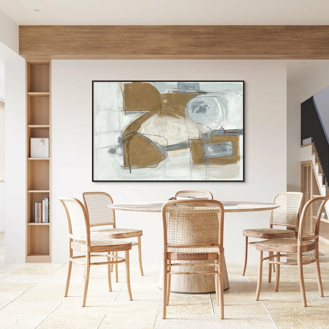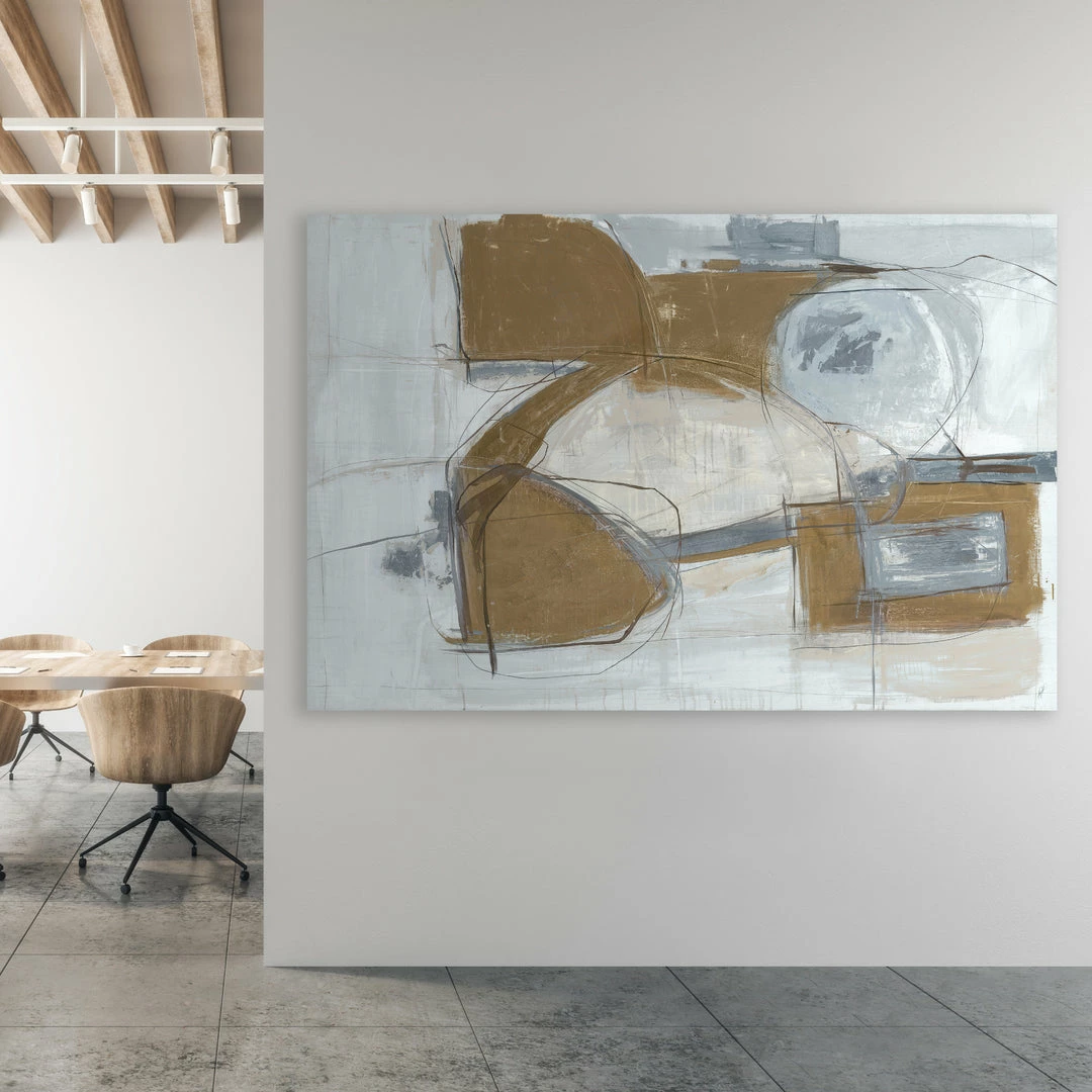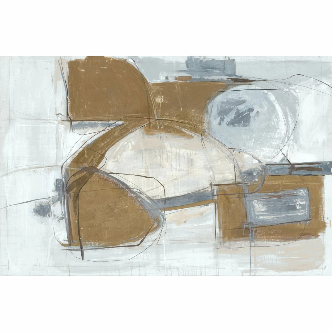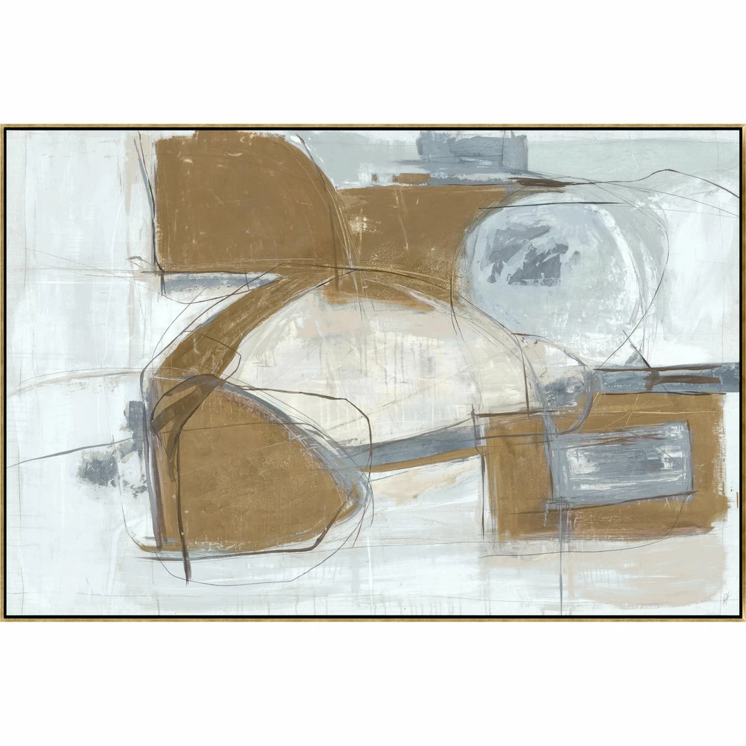 “Shifting Method” by Kelly O’Neal is printed on canvas with metallic gold leaf that embellishes sections of the artwork. This white, grey and gold abstract gallery-wrapped giclee art is hand stretched over 1.5″ stretcher bar with your choice of optional frame finishes.