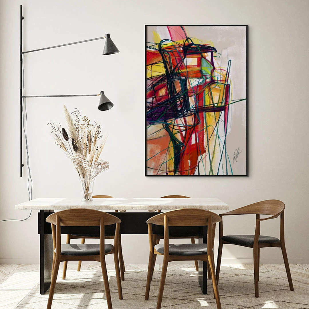 “Sortie” abstract artwork by Kelly O’Neal is printed on canvas with strokes of the original image applied with an artist brush to enhance the authentic feel of the piece. This gallery-wrapped giclee is hand stretched over 1.5″ stretcher bar with your choice of optional frame finishes.