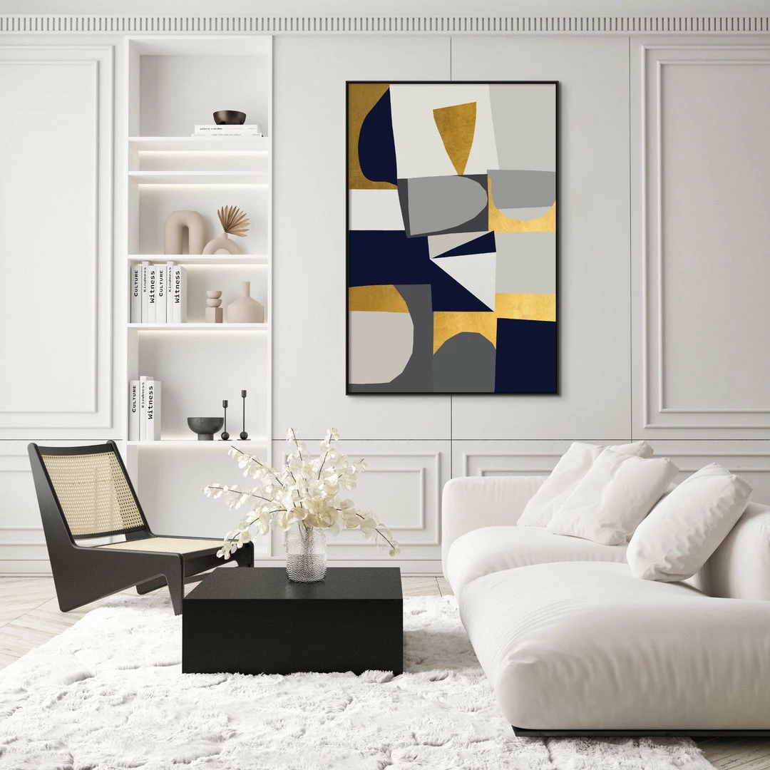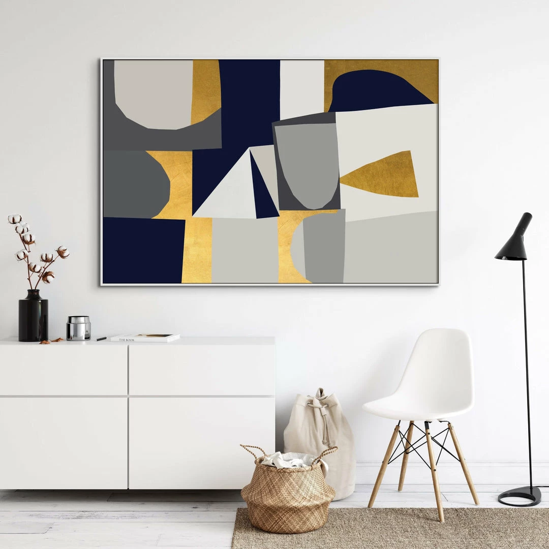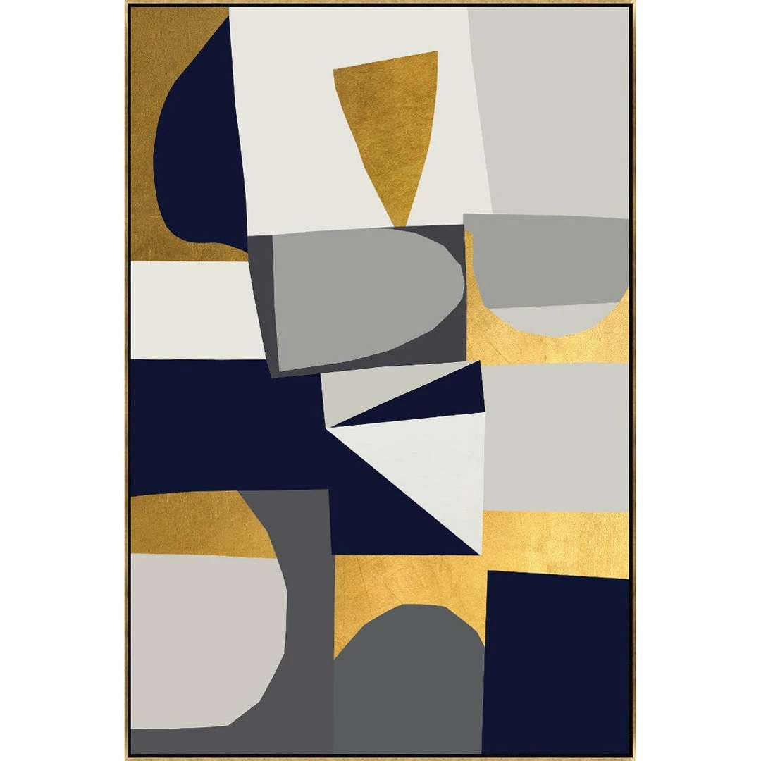 “Jig Saw” by Fern Cassidy is printed on canvas with metallic gold leaf that embellishes sections of the artwork. This navy and gold geometric gallery-wrapped giclee is hand stretched over 1.5″ stretcher bar with your choice of optional frame finishes.