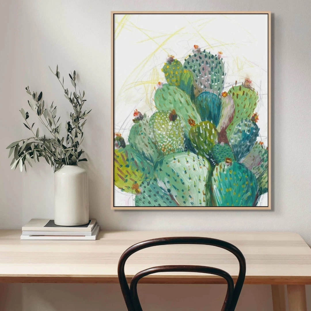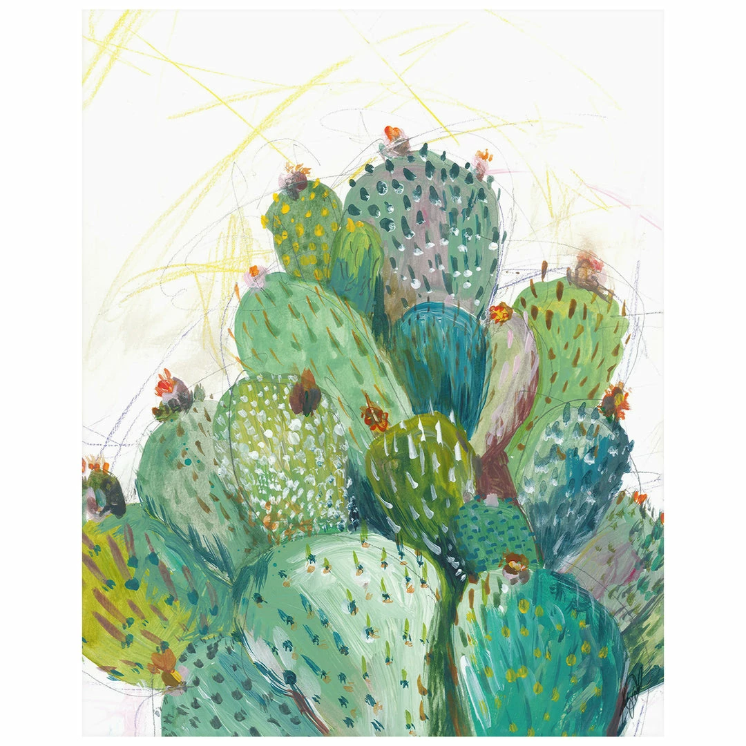 “Landscape 304″ abstract cactus painting by Kelly O’Neal is printed on canvas with strokes of the original image applied with an artist brush to enhance the authentic feel of the piece. This gallery-wrapped giclee is hand stretched over 1.5” stretcher bar with your choice of optional frame finishes.