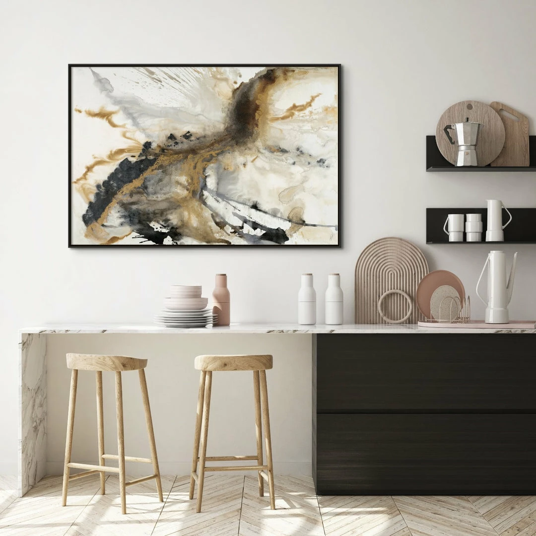 “Personality Traits” abstract artwork by Kelly O’Neal is printed on canvas and hand embellished with metallic gold to bring depth and color, and further enhance the authentic feel of the piece. This gallery-wrapped giclee is hand stretched over 1.5″ stretcher bar with your choice of optional frame finishes.