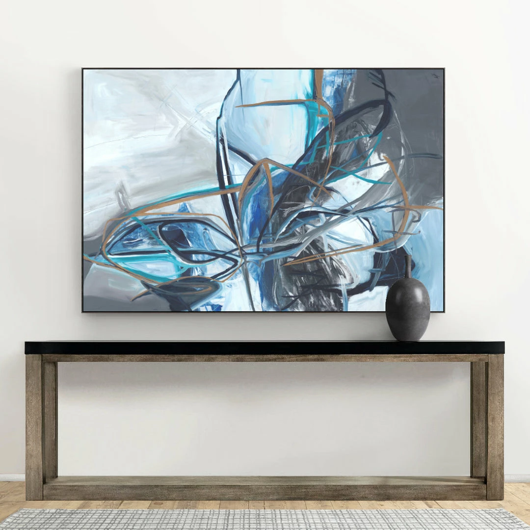 “Testing the Waters” abstract artwork by Kelly O’Neal in deep blue and grey hues is printed on canvas with strokes of the original image applied with an artist brush to enhance the authentic feel of the piece. This gallery-wrapped giclee is hand stretched over 1.5″ stretcher bar with your choice of optional frame finishes.