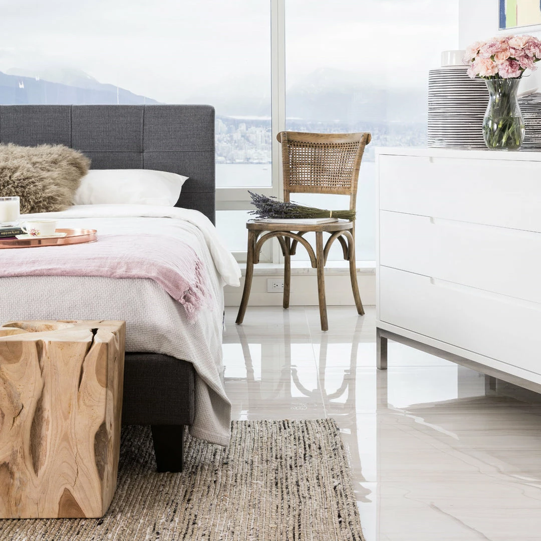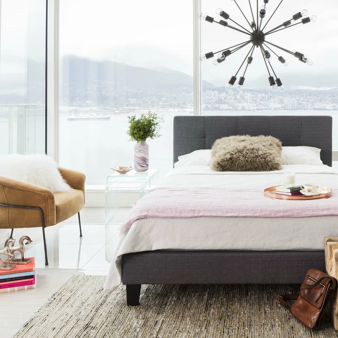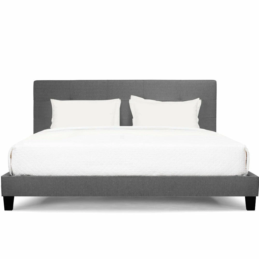 This classic grey fabric bed is warm and inviting. A lined detail in the headboard makes for added interest.