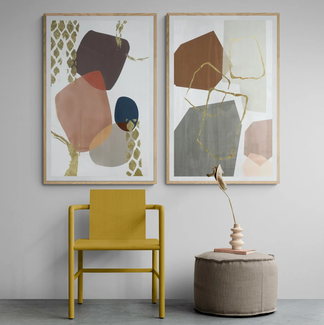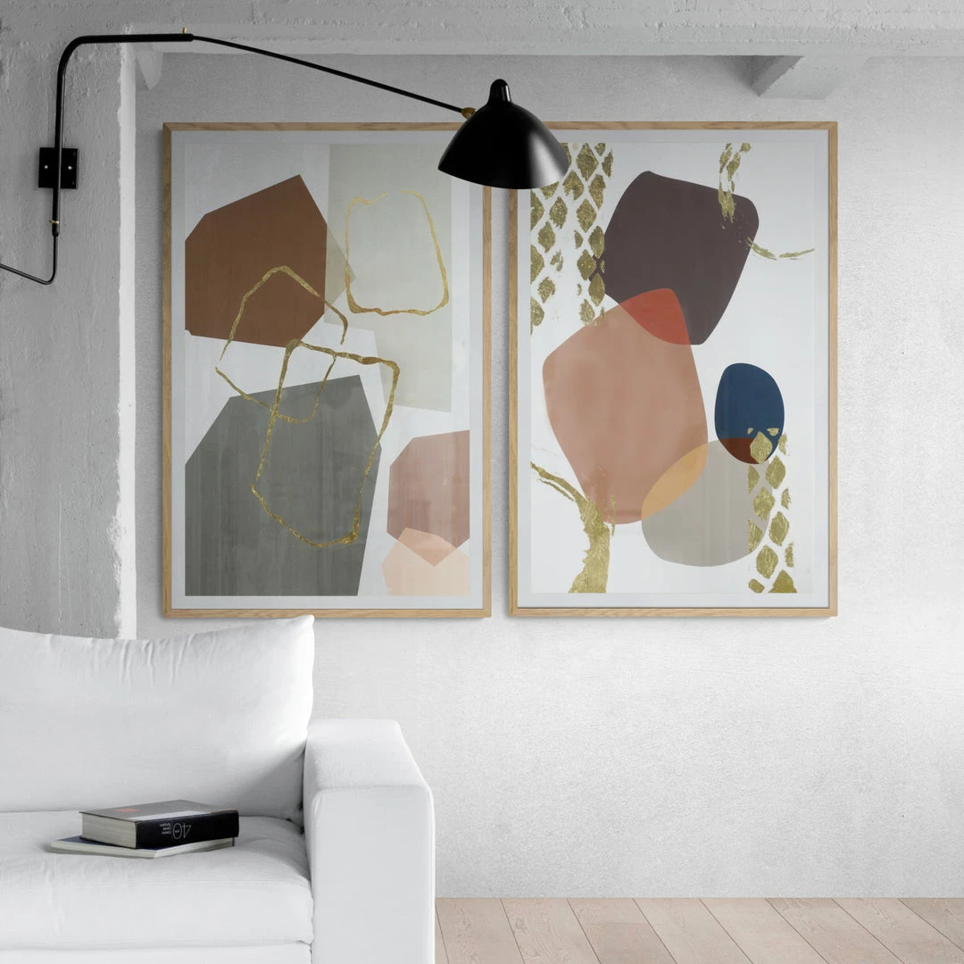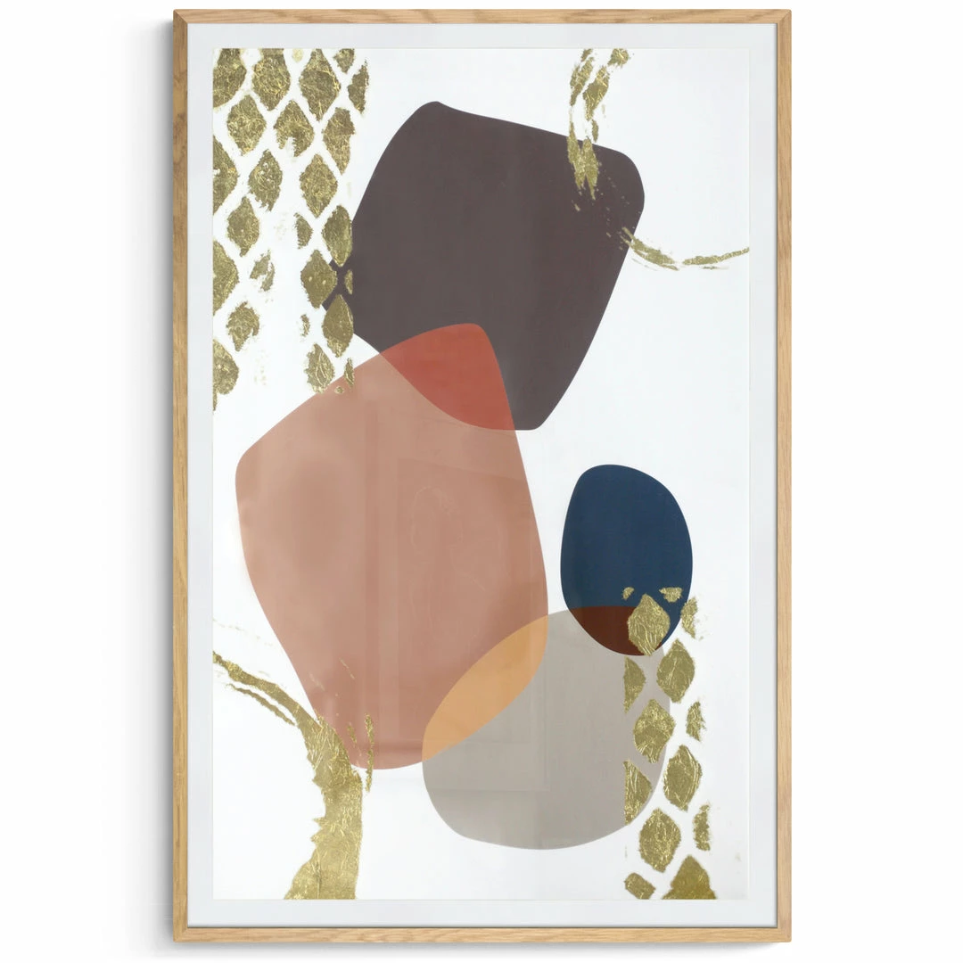 A thoroughly modern design, this glass framed abstract ink print on paper is presented in earthy neutrals and monochromatic pastel tones accented with brilliant gold flake patterns. Finished in a natural oak poly frame with hanging hardware included.