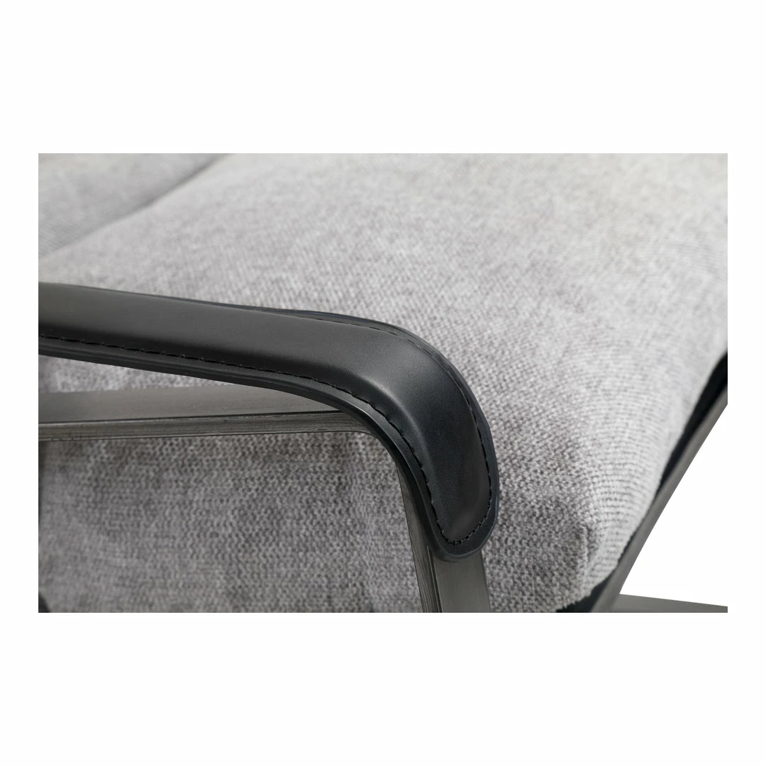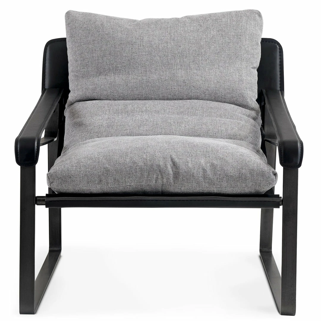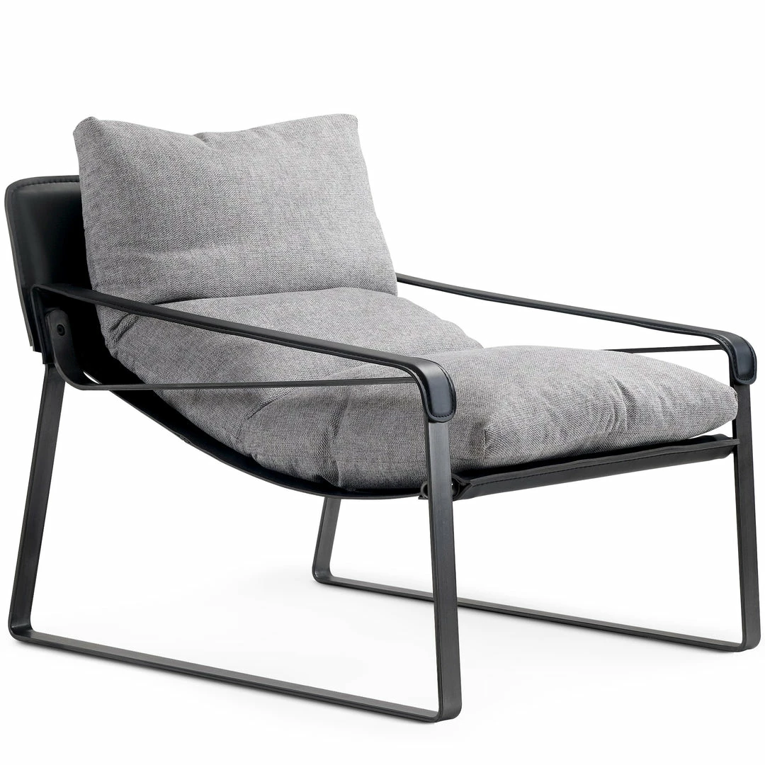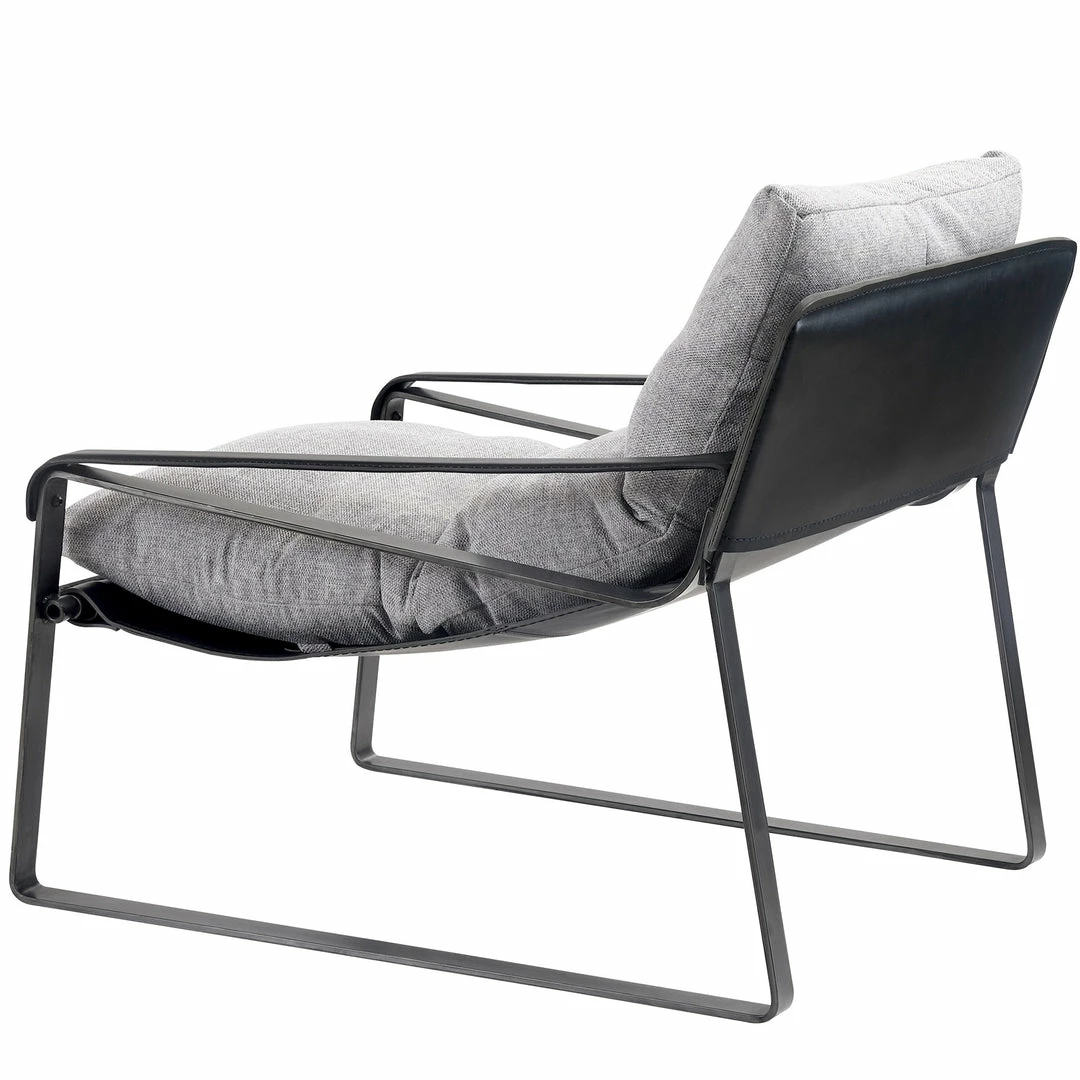 Super stylish, effortlessly cool. The innately hip Connor club chair features a feather-filled cushion with soft grey fabric, perfect for leisurely lounging. It also has a distinctively sturdy leather sling that’s reclined for all sorts of relaxation. A little sculptural with a luxe dash, this chair’s sleek and robust iron frame adds an industrial edge to the smooth black leather.