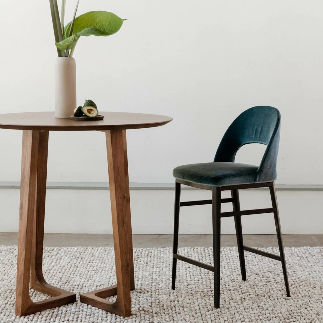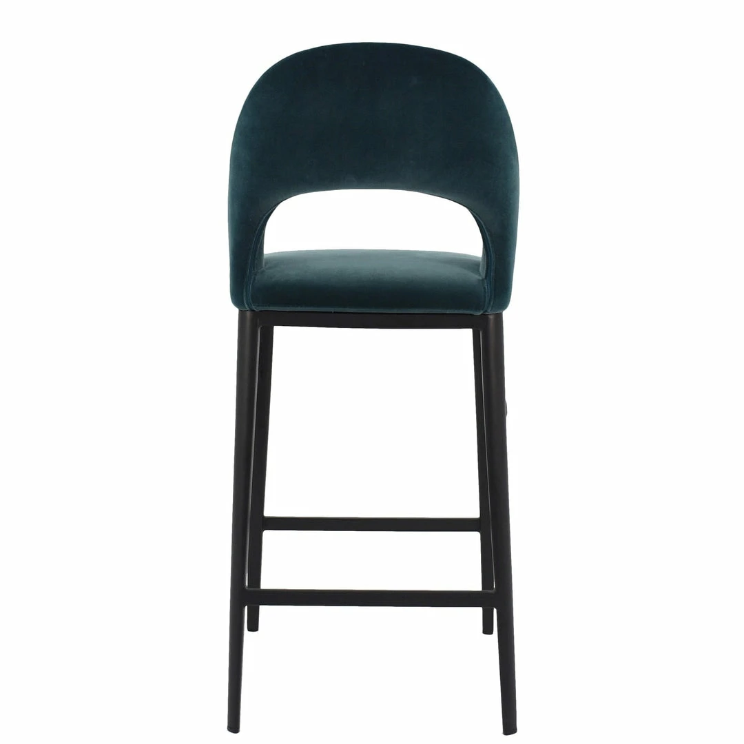 A sleek addition to any kitchen or bar. The Ellery Stools add subtle sophistication with a curved silhouette, cut out back, and plush teal velvet upholstery rounding out this comfortable mid-modern design.