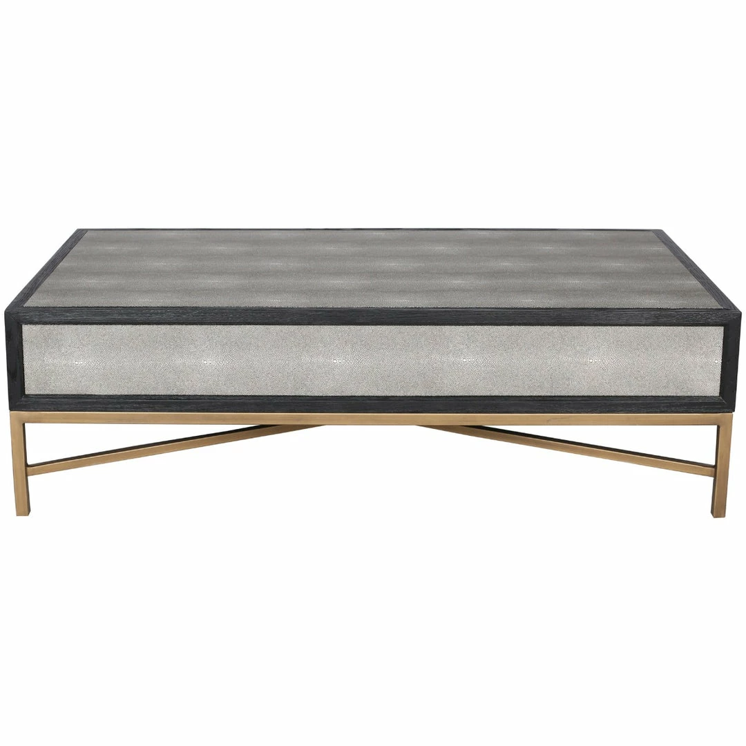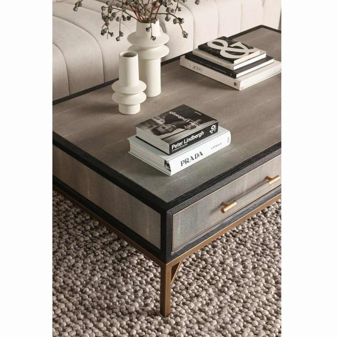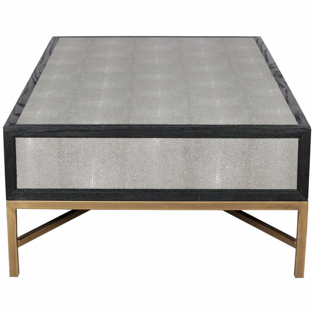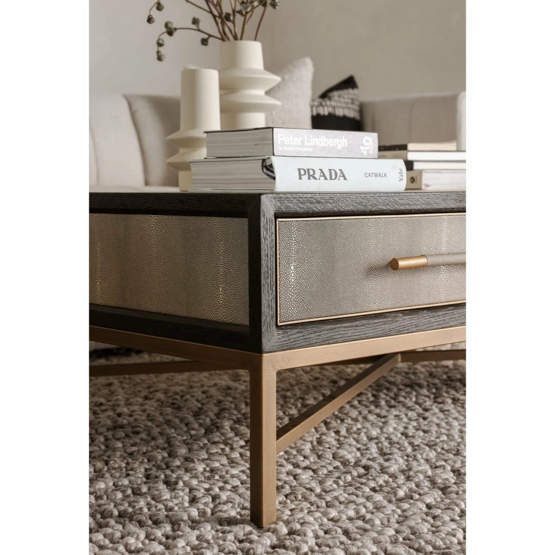 Solid oak wood construction. Contemporary design. The Mako Coffee Table features shagreen surfaces encased in a matt black lacquer frame with warm brass accents for an understated yet elegant look that transitions to any decor.ย