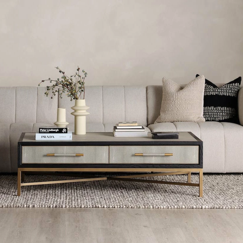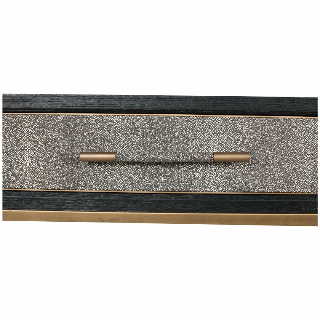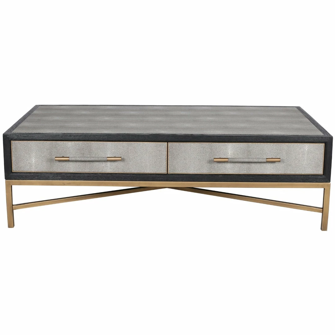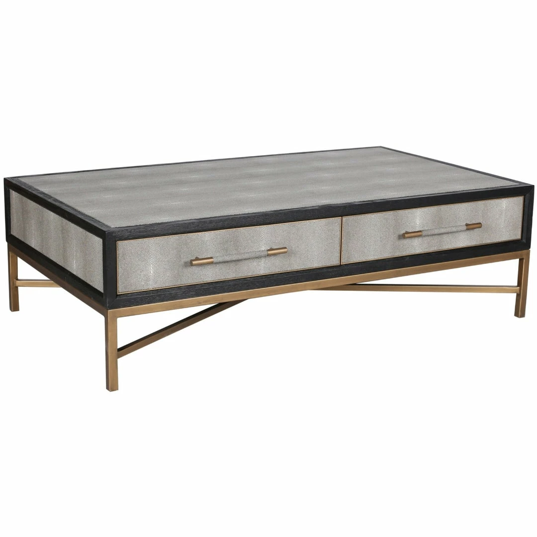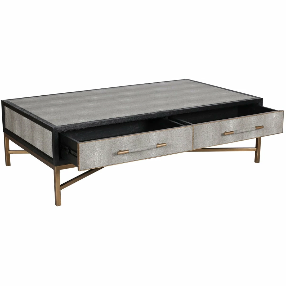 Solid oak wood construction. Contemporary design. The Mako Coffee Table features shagreen surfaces encased in a matt black lacquer frame with warm brass accents for an understated yet elegant look that transitions to any decor.ย