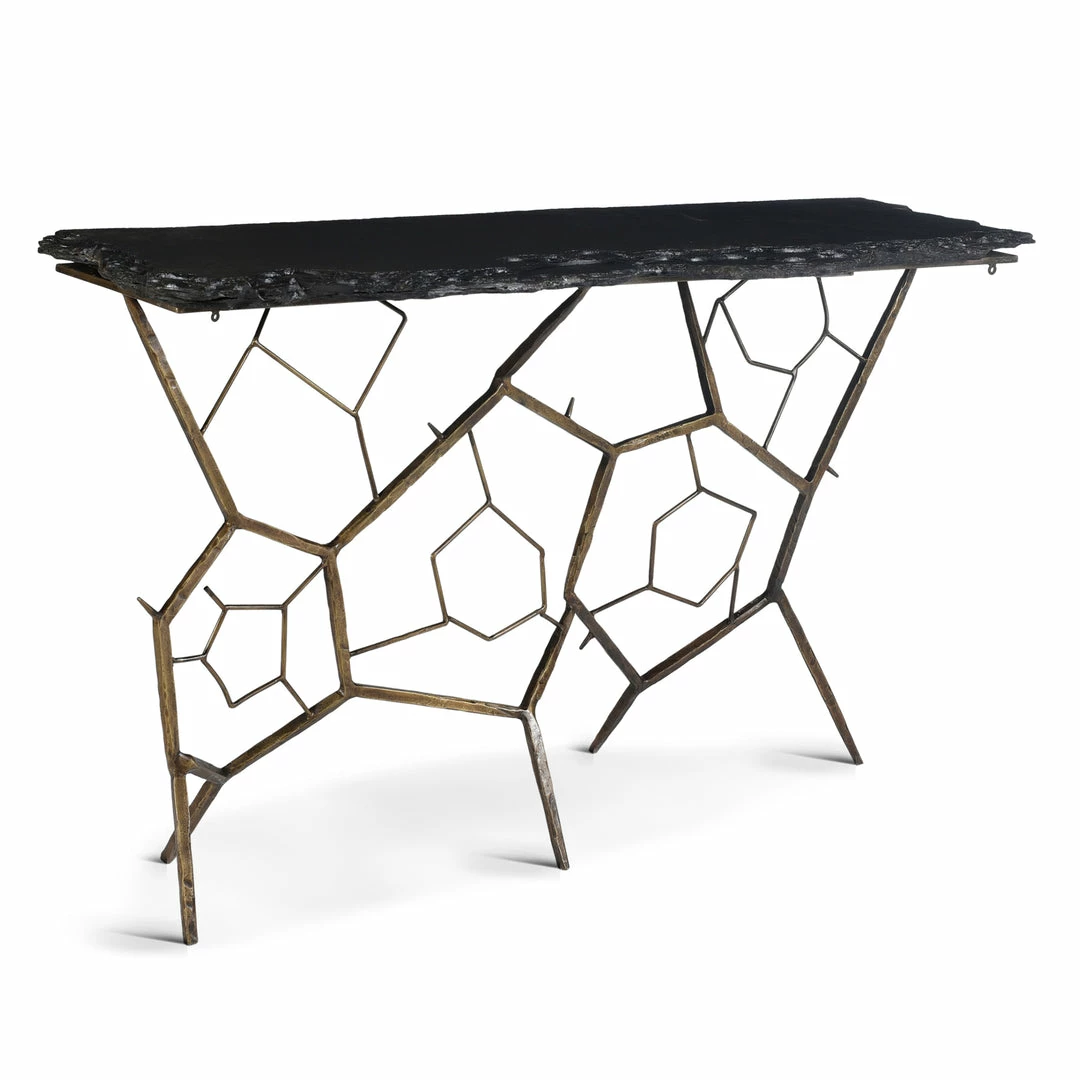 The Positano Slate Console Table is not for the faint of heart. This natural slate table features a dark, rough edge that shows off layers of rock, created slowly by the passing of time. An edgy, iron construction with a complimenting brass finish makes this is a fierce piece of furniture.