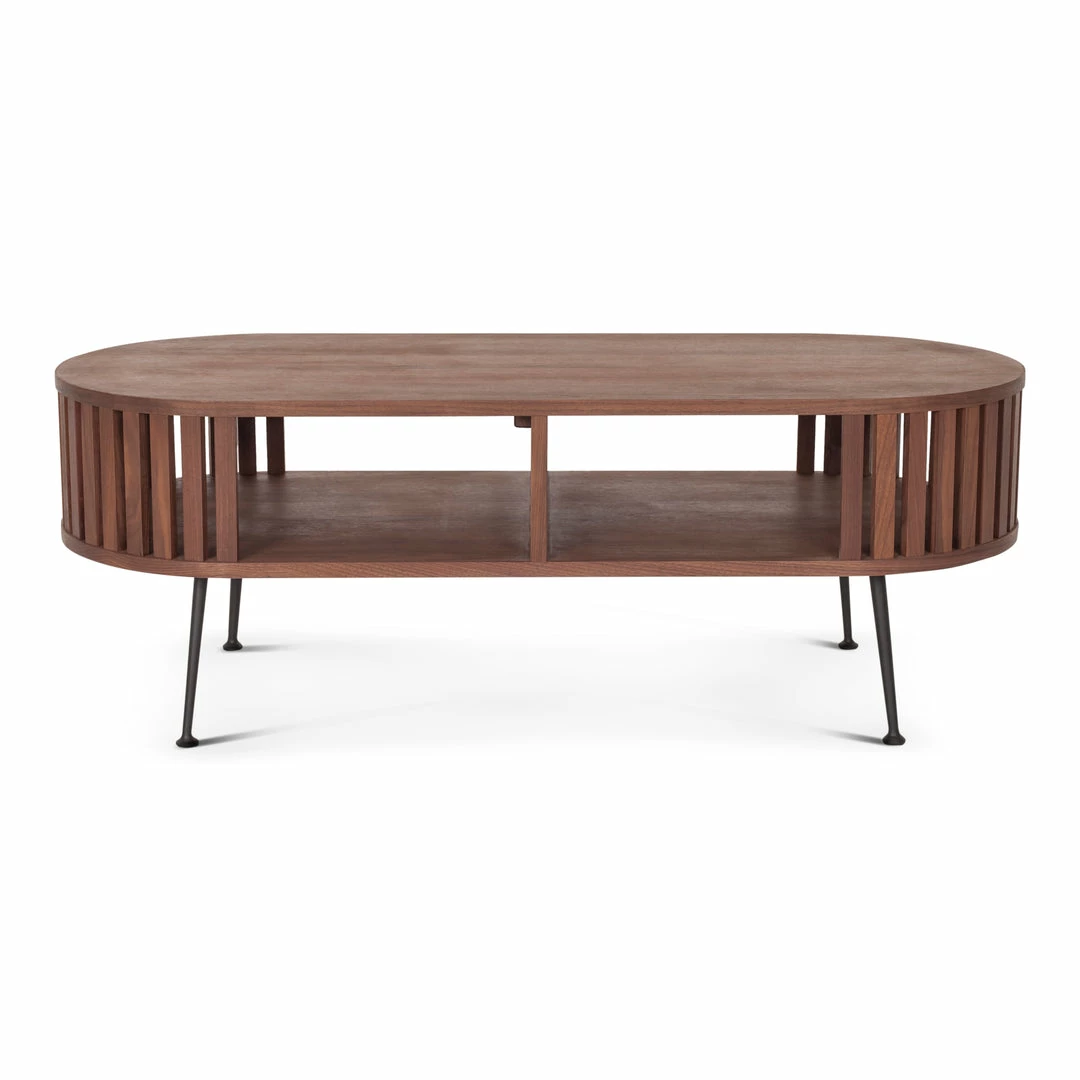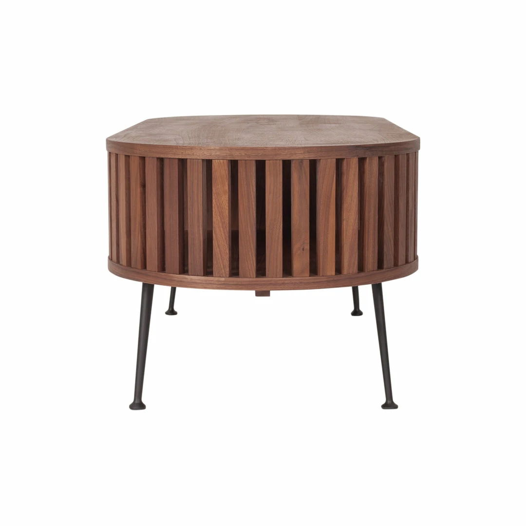 Featuring Mid-century modern style with gently rounded form and gated paneling that details its sides.Β This coffee table is designedΒ with a solid walnut wood mixed with a slender, steel legs making it airy, yet simple. An open shelf is added to keep your essentials handy when needed.