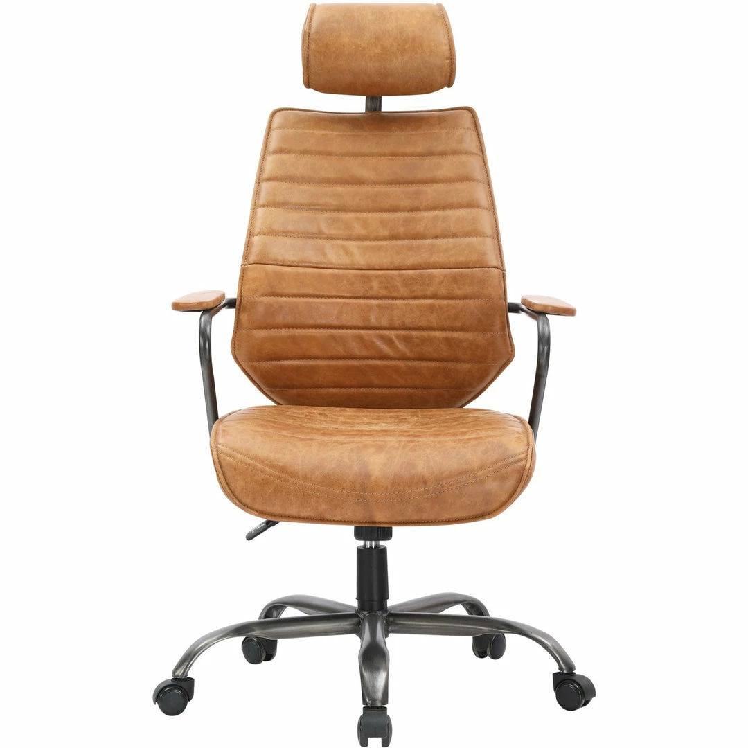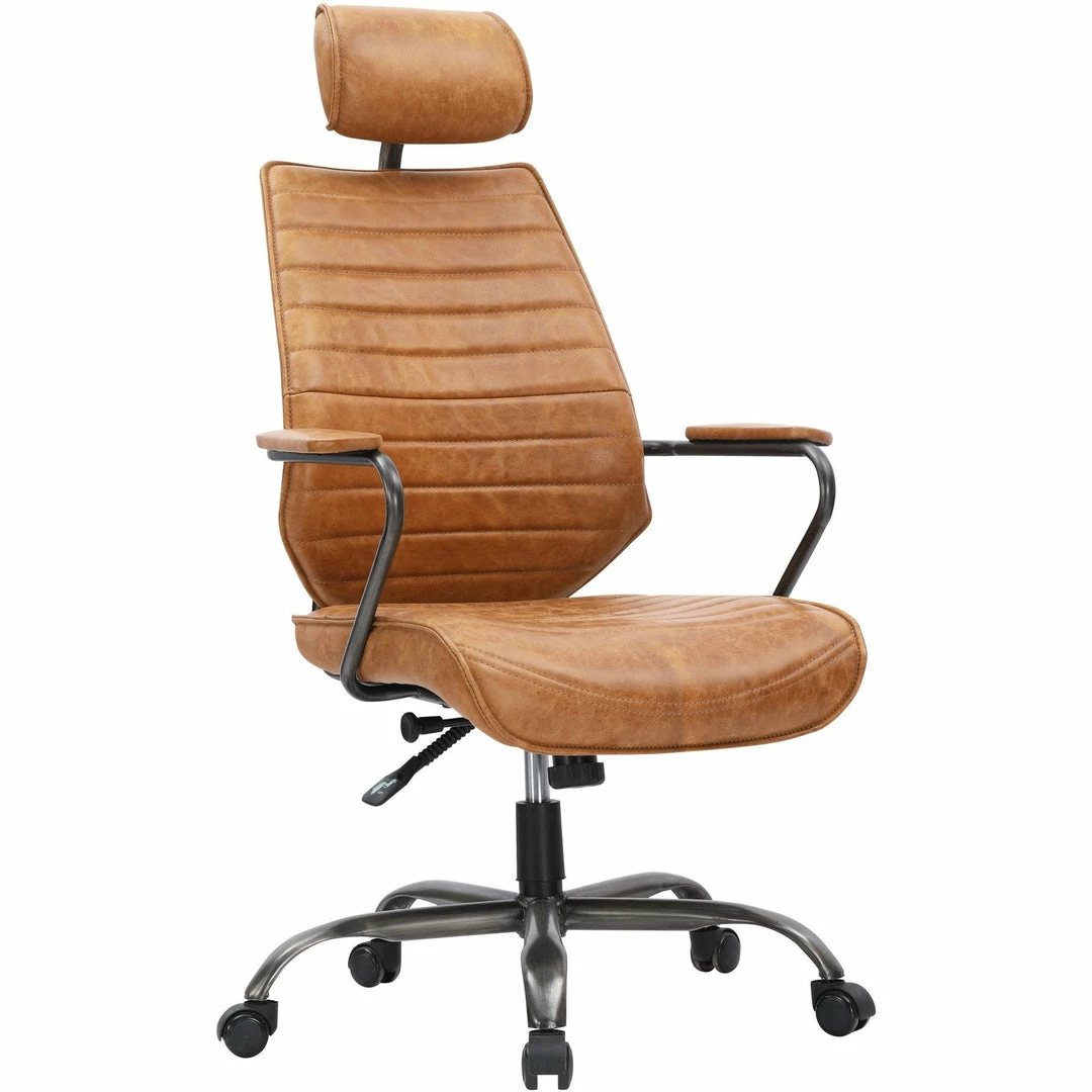 The coolest in vintage industrial office seating with curves, contours, padded armrests, and fully adjustable features. The channeled top-grain leather covers the sculpted seat and back and the sturdy iron base is equipped with easy-glide wheels.