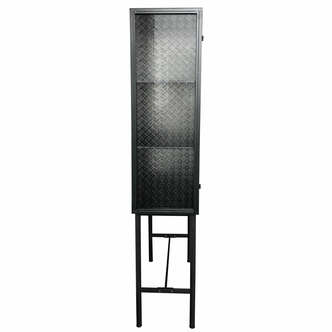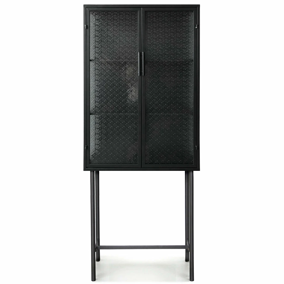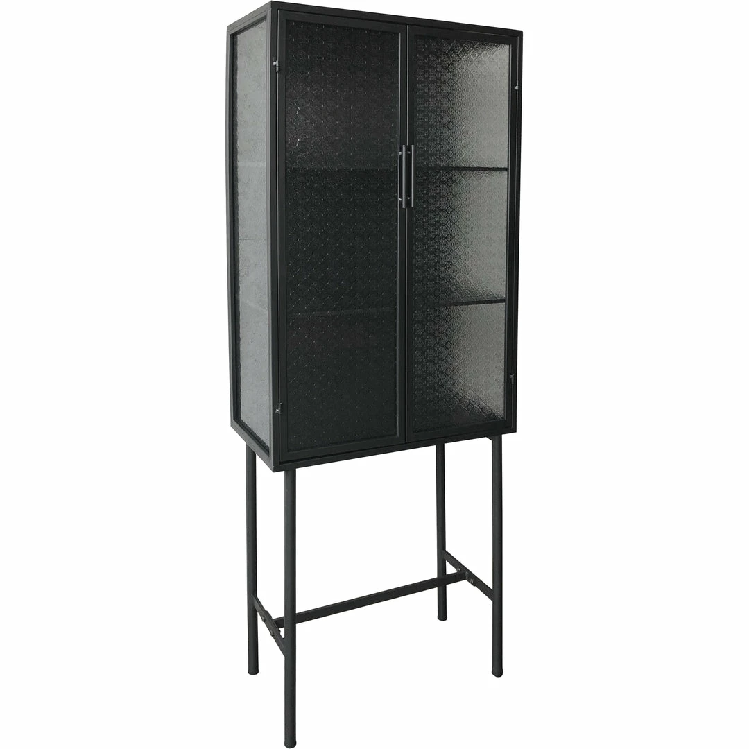 This industrial metal cabinet is a dark iron-and-glass affair. The two tall swinging glass doors have and embossed filigree designΒ for a chic statement while two fixed interior shelves offer a sleek hideaway for your things.