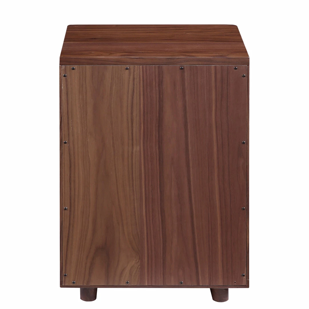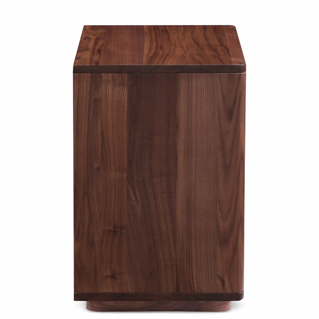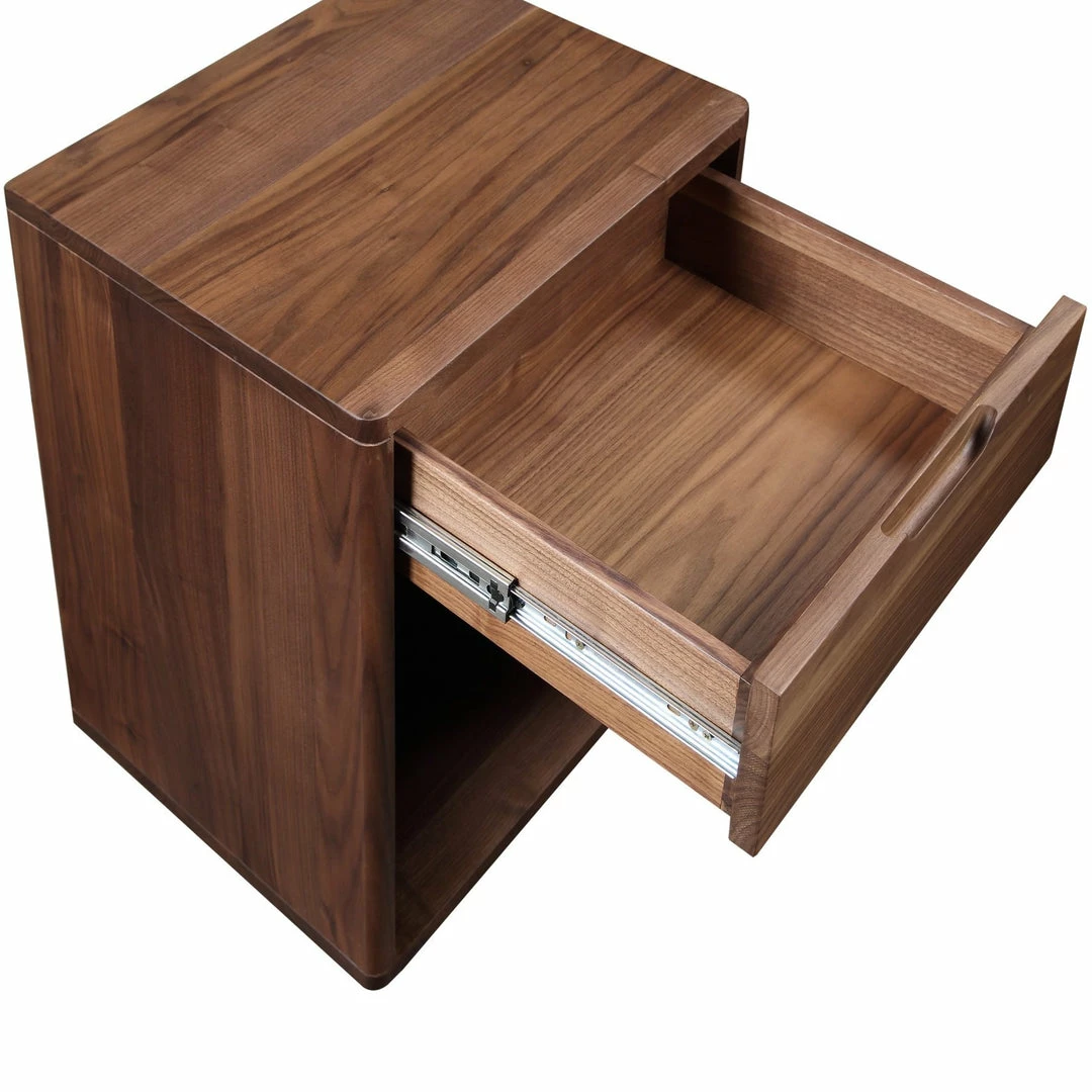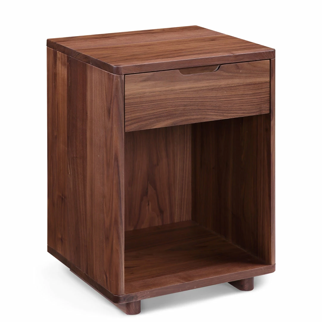Solid walnut forms this rounded Scandinavian-style nightstand. The Jory Nightstand is perfectly scaled for small spaces with a roomy open shelf and single drawer for storage.