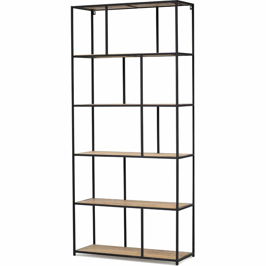 Mango wood shelves brings an organic industrial sense to the simple, open-air iron bookcase.