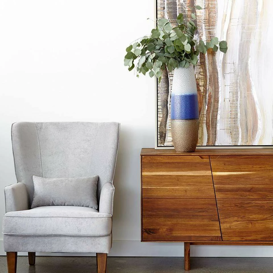 Classic arm-chair style with contemporary lines and a soft, grey upholstery. Perfect for cocktails or the book club.