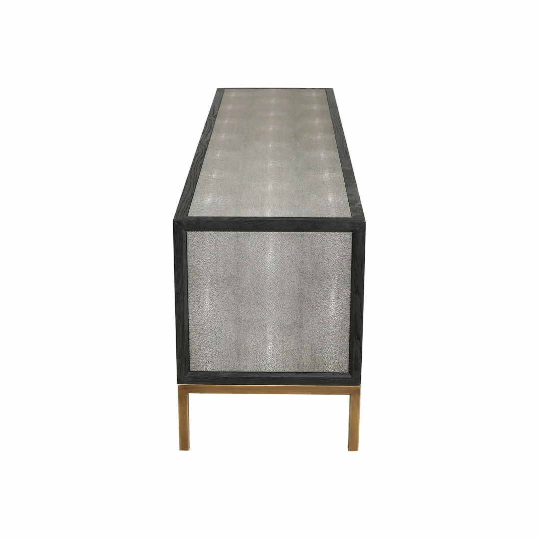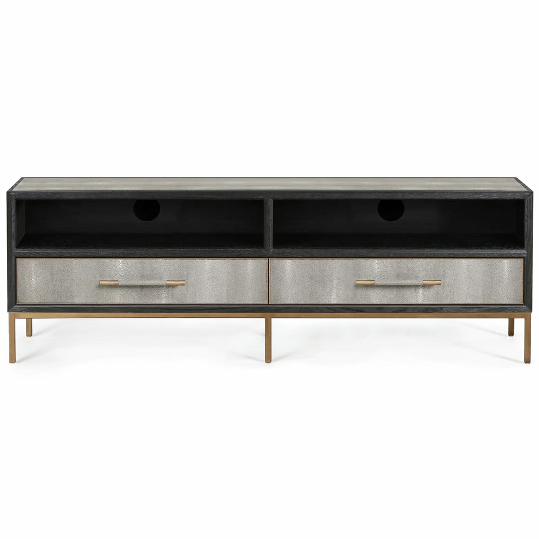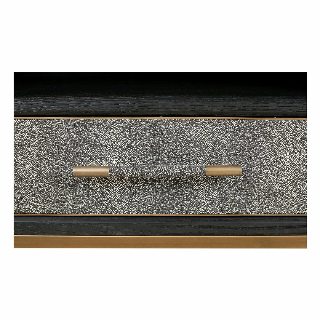 With timeless art deco glamor and chic modern design, the Mako media console is the ultimate home for your entertainment setup. Upholstered in the highest quality vegan leather shagreen and framed in black oak with brass-finished legs, Mako adds effortless style and visual texture to any living space.